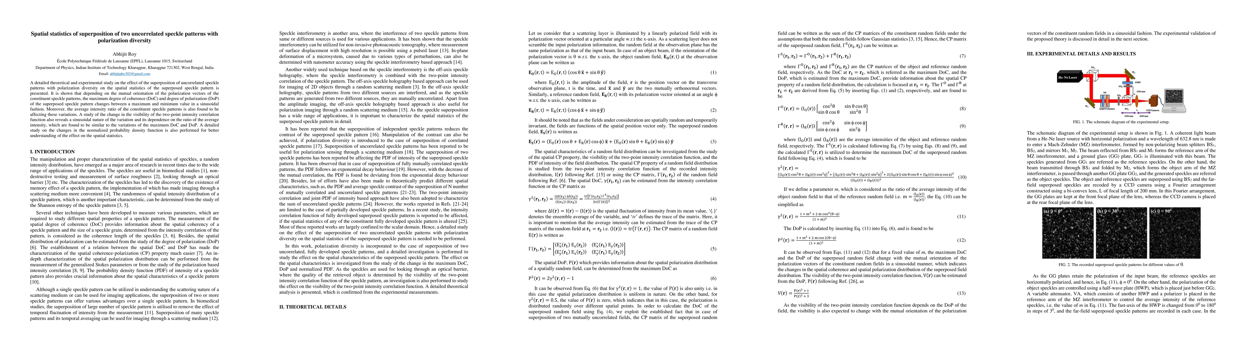 This paper investigates the spatial statistics of superposed uncorrelated speckle patterns with polarization diversity, revealing sinusoidal variations in coherence and polarization degrees based on polarization vector orientation and average intensity ratio. The study also finds similar sinusoidal variations in the visibility of the two-point intensity correlation function and the normalized probability density function.