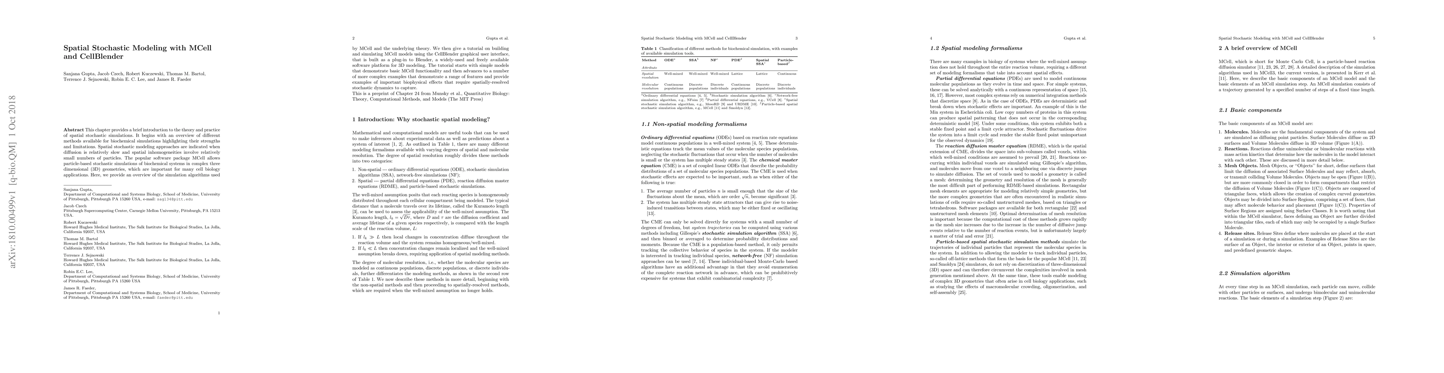 This paper introduces spatial stochastic modeling using MCell and CellBlender, highlighting the strengths of MCell for simulating biochemical systems in complex 3D geometries. It provides a tutorial on building and running simulations with MCell via the CellBlender interface, starting with simple models and progressing to complex examples.