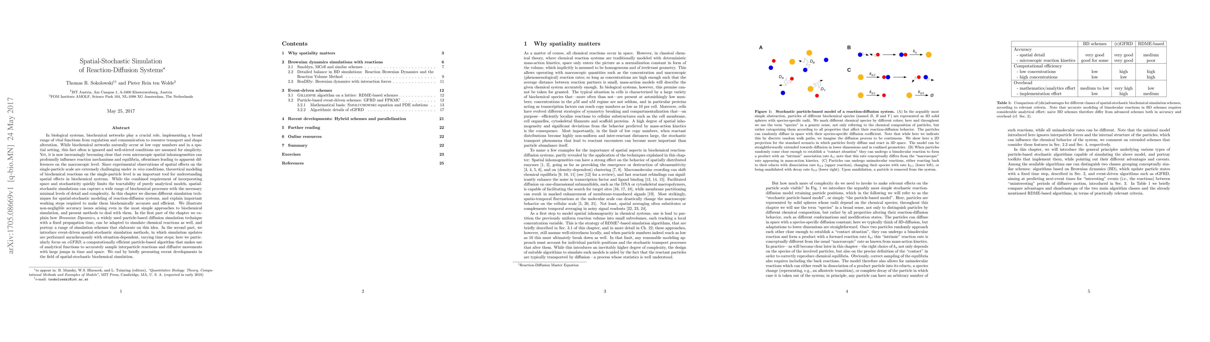 This paper discusses techniques for spatial-stochastic simulation of reaction-diffusion systems, emphasizing the importance of capturing biochemical processes at the single-particle level. It introduces methods like Brownian Dynamics and event-driven approaches, particularly focusing on the eGFRD algorithm, to address accuracy issues and computational efficiency in modeling biochemical reactions.