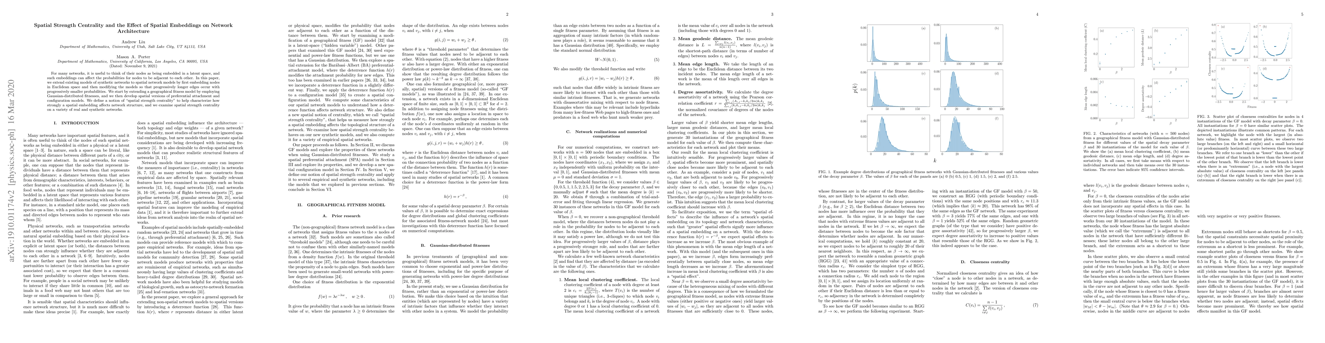 This paper introduces spatial network models by embedding nodes in Euclidean space, where longer edges have smaller probabilities. It extends geographical fitness, preferential attachment, and configuration models. A 'spatial strength centrality' measure is defined to assess the impact of spatial embedding on network structure, analyzed on real and synthetic networks.