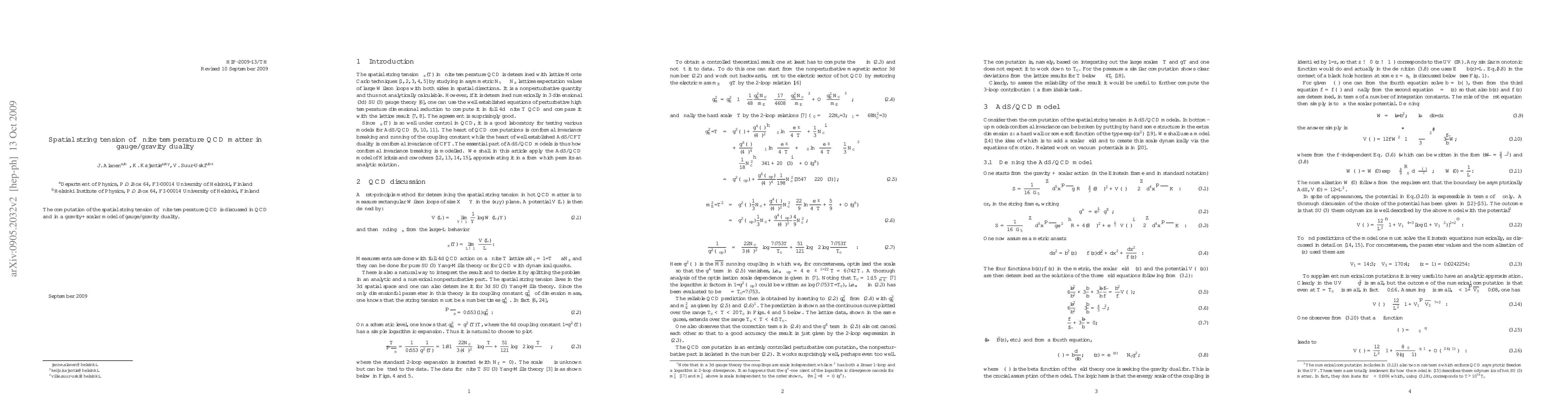 Summary: This paper investigates the spatial string tension in finite temperature Quantum Chromodynamics (QCD) using both QCD calculations and a gravity+scalar model within the framework of gauge/gravity duality. The results aim to provide insights into the strong force interactions at elevated temperatures.