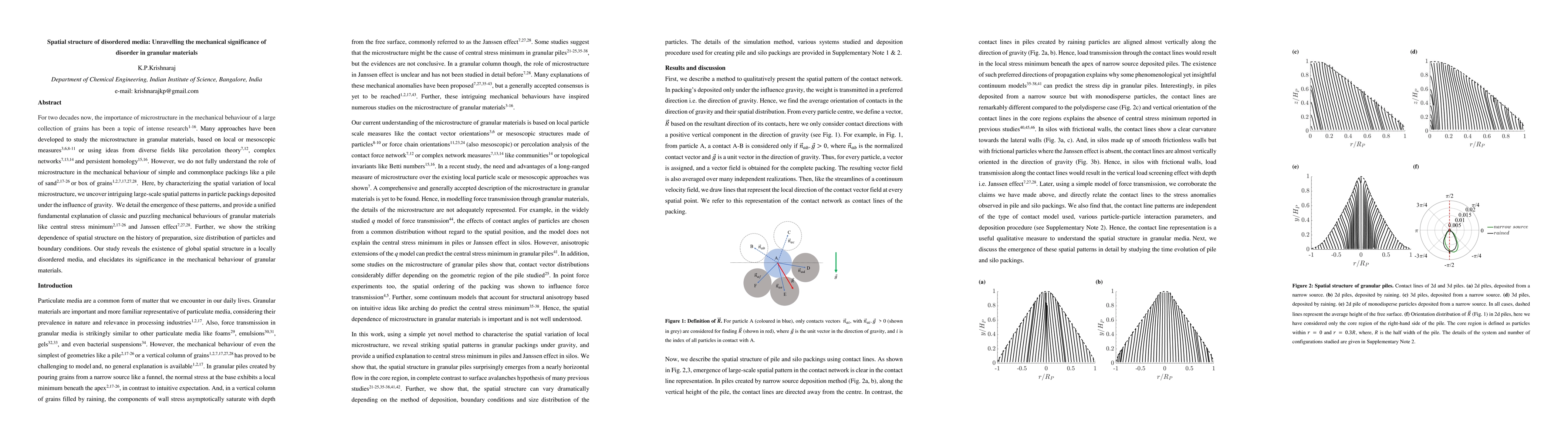This paper investigates the spatial structure of disordered granular materials, revealing large-scale patterns in particle packings and providing a unified explanation for classic mechanical behaviors like the central stress minimum and Janssen effect. It highlights the influence of preparation history, particle size distribution, and boundary conditions on these spatial structures.
