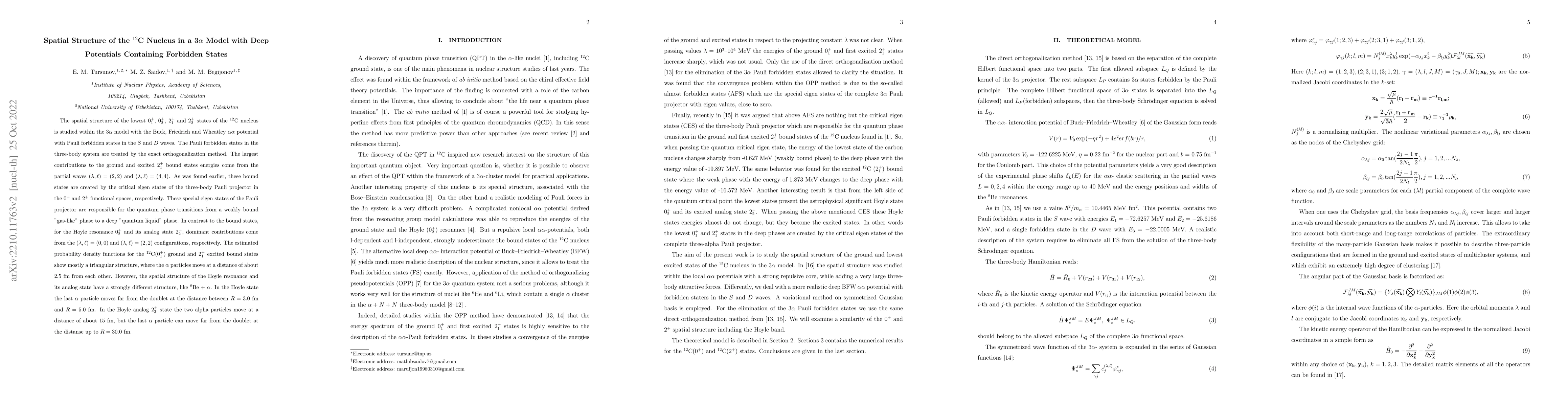 The spatial structure of the lowest 0$_1^+$, 0$_2^+$, 2$_1^+$ and 2$_2^+$ states of the $^{12}$C nucleus is studied within the 3$\alpha$ model with the Buck, Friedrich, and Wheatley $\alpha \alpha$ potential with Pauli forbidden states in the $S$ and $D$ waves. The Pauli forbidden states in the three-body system are treated by the exact orthogonalization method. The largest contributions to the ground and excited 2$_1^+$ bound states energies come from the partial waves $(\lambda, \ell)=(2,2)$ and $(\lambda, \ell)=(4,4)$. As was found earlier, these bound states are created by the critical eigenstates of the three-body Pauli projector in the 0$^+$ and 2$^+$ functional spaces, respectively. These special eigenstates of the Pauli projector are responsible for the quantum phase transitions from a weakly bound "gas-like" phase to a deep "quantum liquid" phase. In contrast to the bound states, for the Hoyle resonance 0$_2^+$ and its analog state 2$_2^+$, dominant contributions come from the $(\lambda, \ell)=(0,0)$ and $(\lambda, \ell)=(2,2)$ configurations, respectively. The estimated probability density functions for the $^{12}$C(0$_1^+$) ground and 2$_1^+$ excited bound states show mostly a triangular structure, where the $\alpha$ particles move at a distance of about 2.5 fm from each other. However, the spatial structure of the Hoyle resonance and its analog state have a strongly different structure, like $^8$Be + $\alpha$. In the Hoyle state, the last $\alpha$ particle moves far from the doublet at the distance between $R=3.0$ fm and $R=5.0$ fm. In the Hoyle analog 2$_2^+$ state the two alpha particles move at a distance of about 15 fm, but the last $\alpha$ particle can move far from the doublet at the distance up to $R=30.0$ fm.