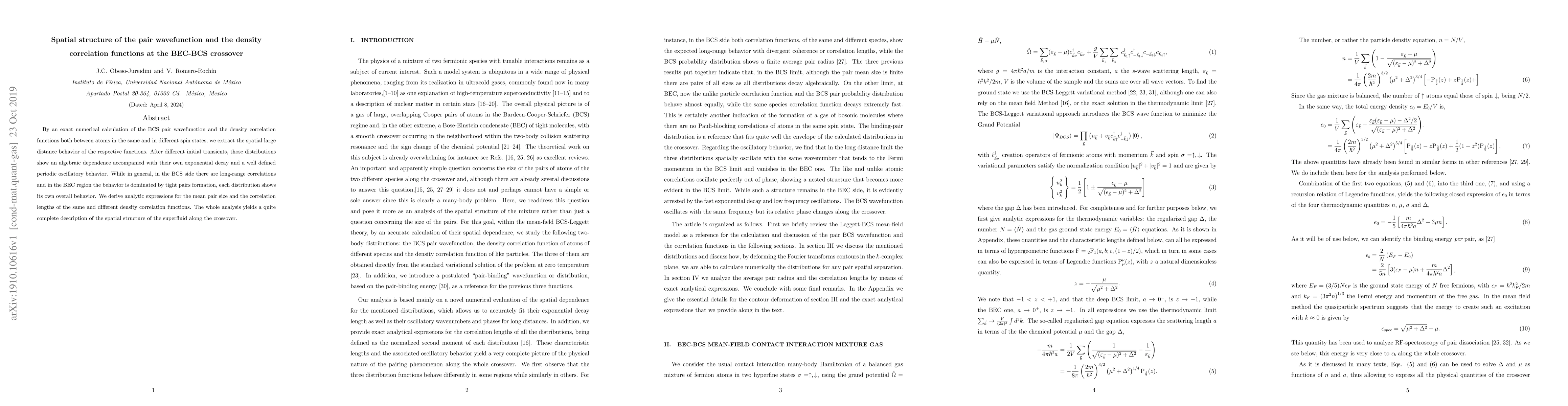 This paper provides an exact numerical analysis of BCS pair wavefunctions and density correlation functions, revealing algebraic and exponential decay behaviors along with periodic oscillations. It derives analytic expressions for mean pair size and correlation lengths, offering a comprehensive spatial structure description of superfluidity across the BEC-BCS crossover.