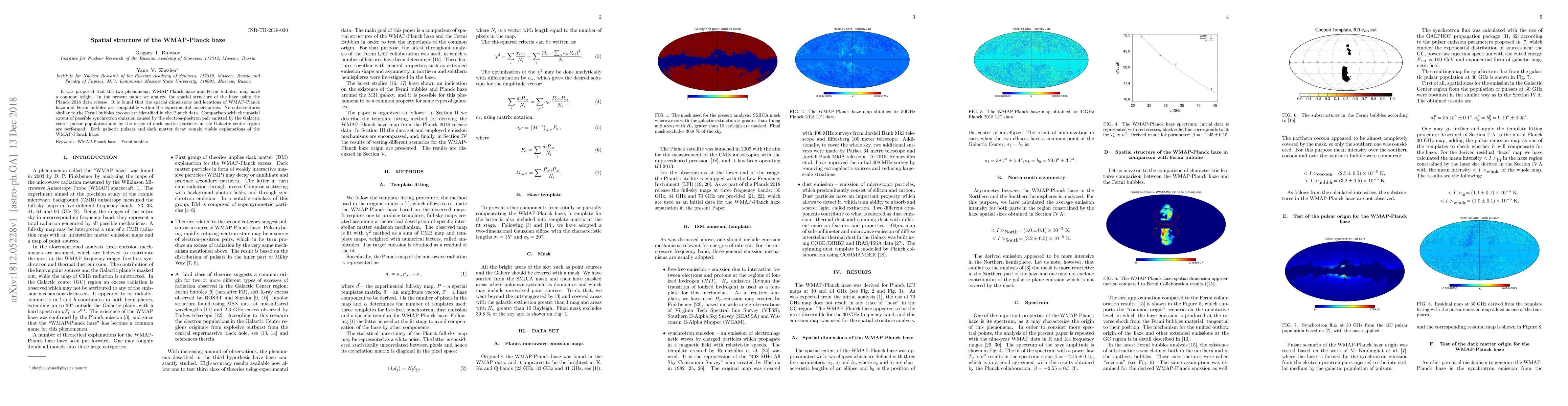 This paper investigates the spatial structure of the WMAP-Planck haze using Planck 2018 data, finding it compatible with Fermi bubbles' locations and dimensions within experimental uncertainties. Both Galactic pulsars and dark matter decay are proposed as viable origins for the haze.