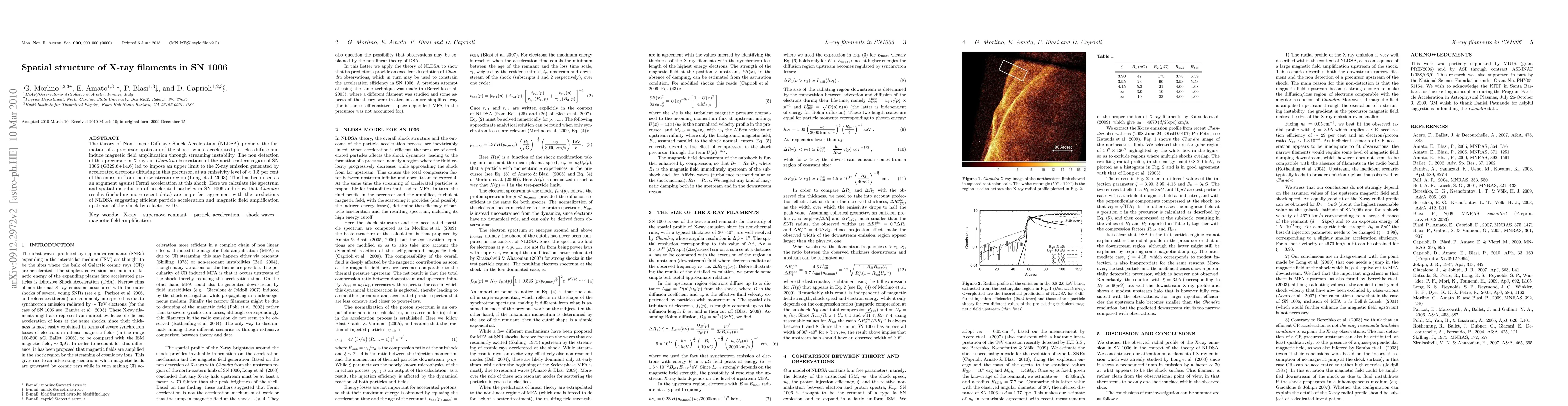 The research applies the Non-Linear Diffusive Shock Acceleration (NLDSA) theory to analyze the spatial structure of X-ray filaments in SN 1006, considering magnetic field amplification and particle acceleration upstream of the shock.