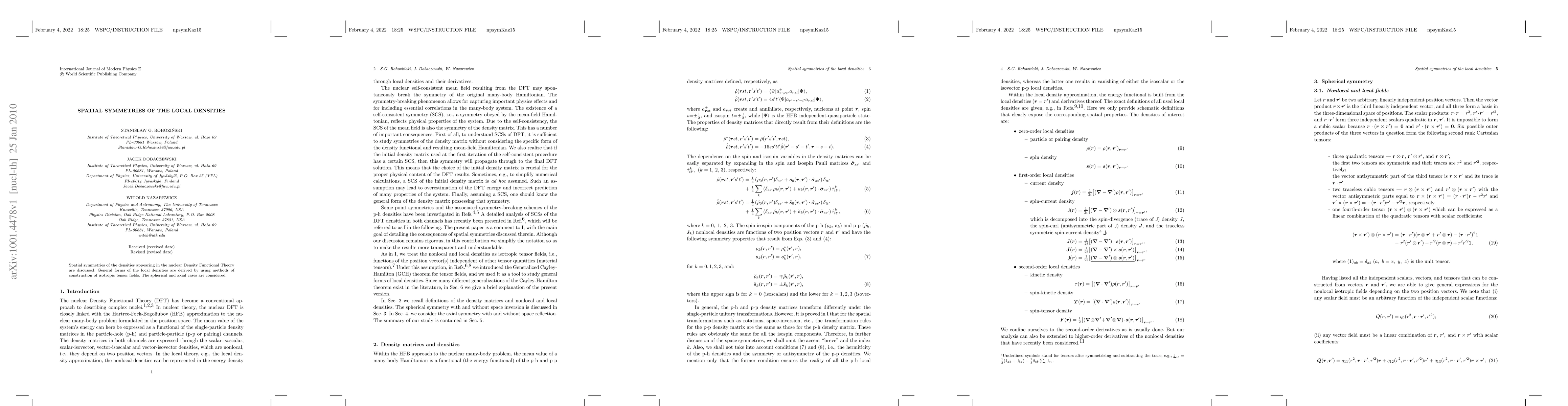 Spatial symmetries of the densities appearing in the nuclear Density Functional Theory are discussed. General forms of the local densities are derived by using methods of construction of isotropic tensor fields. The spherical and axial cases are considered.