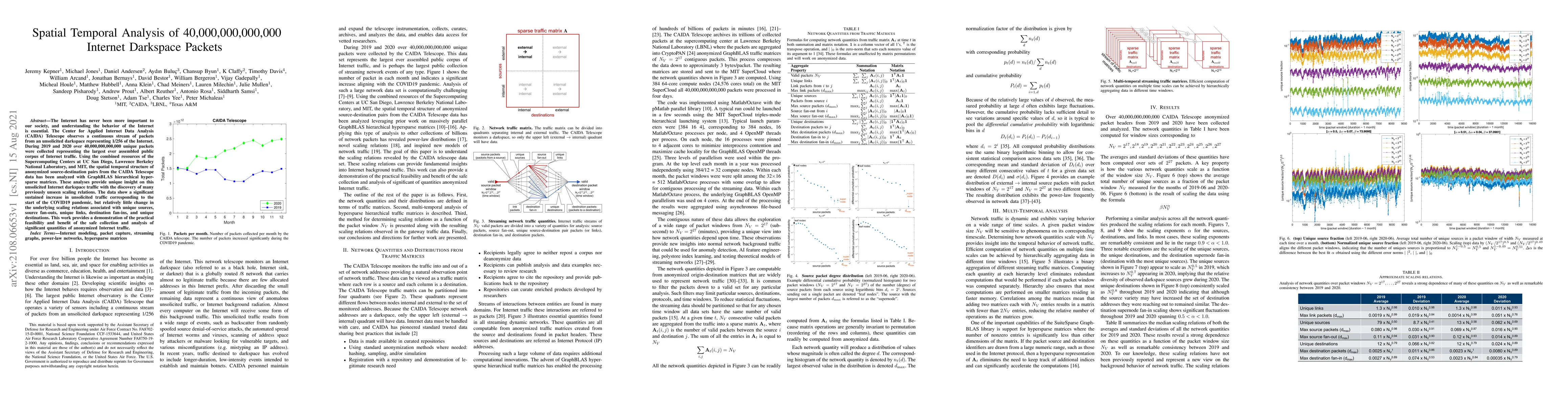 The Internet has never been more important to our society, and understanding the behavior of the Internet is essential. The Center for Applied Internet Data Analysis (CAIDA) Telescope observes a continuous stream of packets from an unsolicited darkspace representing 1/256 of the Internet. During 2019 and 2020 over 40,000,000,000,000 unique packets were collected representing the largest ever assembled public corpus of Internet traffic. Using the combined resources of the Supercomputing Centers at UC San Diego, Lawrence Berkeley National Laboratory, and MIT, the spatial temporal structure of anonymized source-destination pairs from the CAIDA Telescope data has been analyzed with GraphBLAS hierarchical hypersparse matrices. These analyses provide unique insight on this unsolicited Internet darkspace traffic with the discovery of many previously unseen scaling relations. The data show a significant sustained increase in unsolicited traffic corresponding to the start of the COVID19 pandemic, but relatively little change in the underlying scaling relations associated with unique sources, source fan-outs, unique links, destination fan-ins, and unique destinations. This work provides a demonstration of the practical feasibility and benefit of the safe collection and analysis of significant quantities of anonymized Internet traffic.