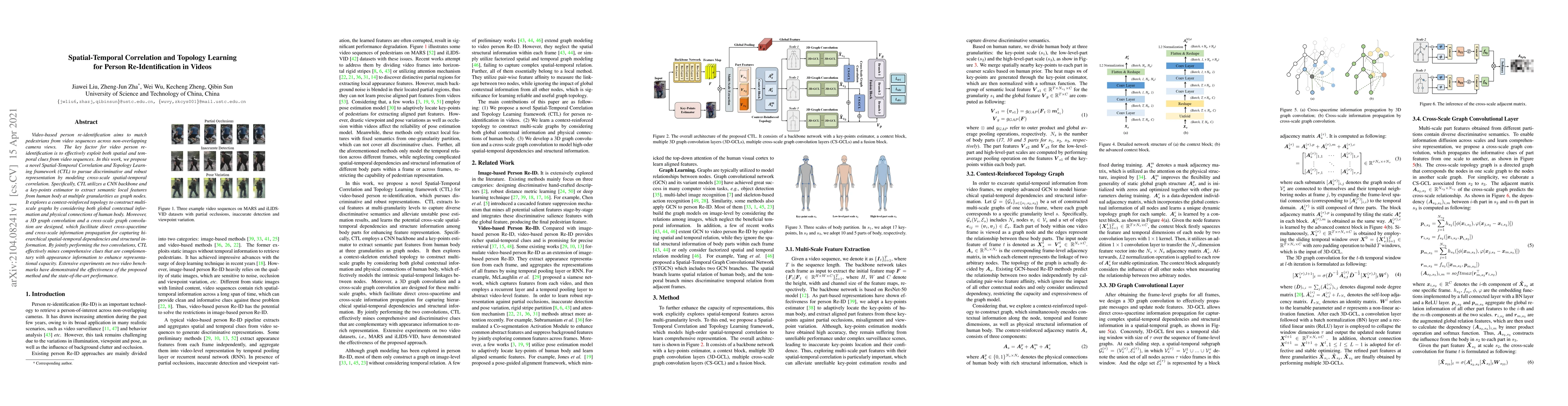 This paper proposes a Spatial-Temporal Correlation and Topology Learning framework (CTL) for video-based person re-identification, utilizing a CNN and key-point estimator to extract multi-scale graph representations of human bodies. The framework employs 3D and cross-scale graph convolutions to capture hierarchical spatial-temporal dependencies, achieving state-of-the-art performance on video benchmarks.