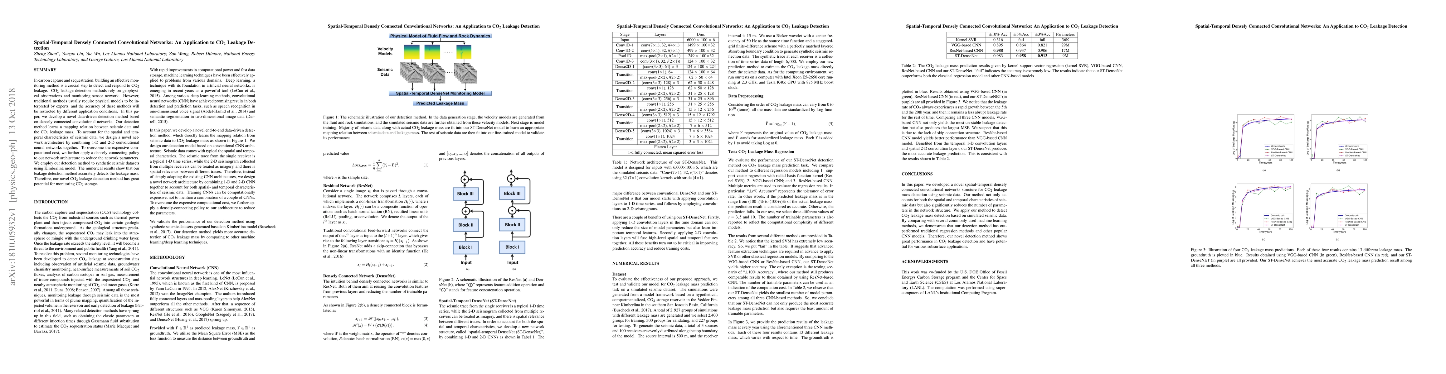 In carbon capture and sequestration, building an effective monitoring method is a crucial step to detect and respond to CO2 leakage. CO2 leakage detection methods rely on geophysical observations and monitoring sensor network. However, traditional methods usually require physical models to be interpreted by experts, and the accuracy of these methods will be restricted by different application conditions. In this paper, we develop a novel data-driven detection method based on densely connected convolutional networks. Our detection method learns a mapping relation between seismic data and the CO2 leakage mass. To account for the spatial and temporal characteristics of seismic data, we design a novel network architecture by combining 1-D and 2-D convolutional neural networks together. To overcome the expensive computational cost, we further apply a densely-connecting policy to our network architecture to reduce the network parameters. We employ our detection method to synthetic seismic datasets using Kimberlina model. The numerical results show that our leakage detection method accurately detects the leakage mass. Therefore, our novel CO2 leakage detection method has great potential for monitoring CO2 storage.