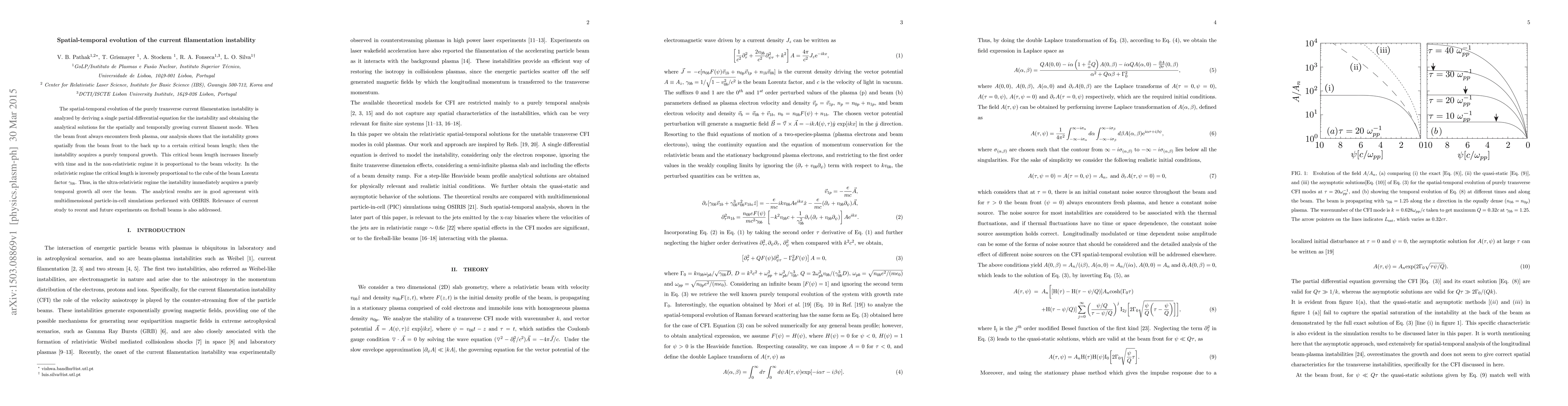 This paper analyzes the spatial-temporal evolution of the current filamentation instability, deriving a partial differential equation and finding analytical solutions for the instability's growth. It reveals that the instability grows spatially until reaching a critical beam length, after which it transitions to purely temporal growth, with the critical length's behavior differing in non-relativistic and relativistic regimes.
