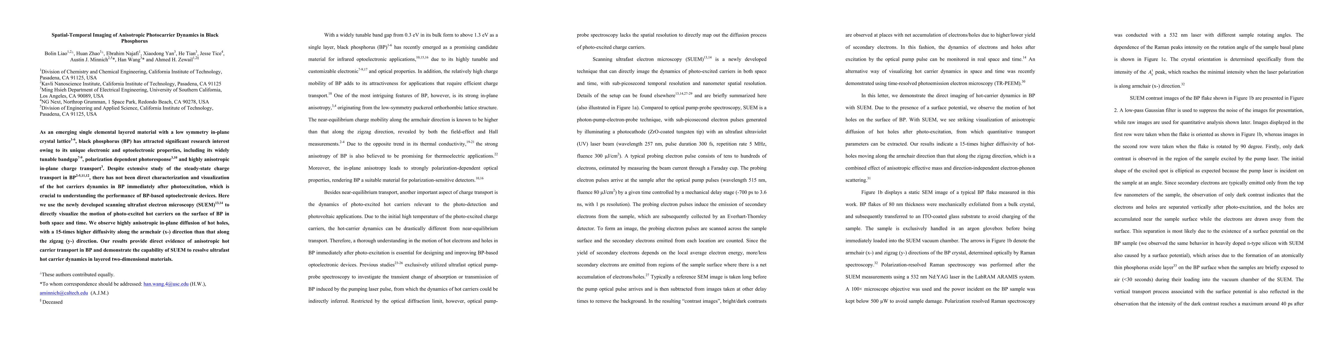 This study uses scanning ultrafast electron microscopy (SUEM) to directly visualize the anisotropic spatial-temporal dynamics of hot carriers in black phosphorus immediately after photoexcitation, revealing significantly higher diffusivity of hot holes along the armchair direction. The findings highlight the material's unique anisotropic transport properties and SUEM's effectiveness for probing ultrafast dynamics in 2D materials.