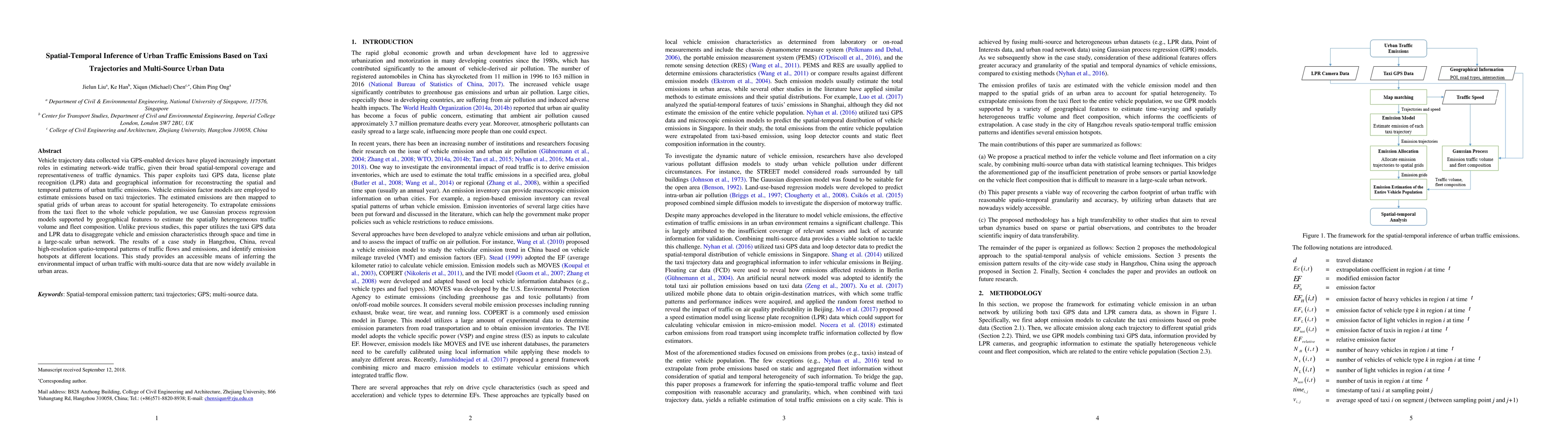 This paper uses taxi GPS data, license plate recognition, and geographical information to reconstruct urban traffic emissions patterns, employing vehicle emission factor models and Gaussian process regression to estimate emissions and identify hotspots in Hangzhou, China. The study provides a high-resolution spatiotemporal analysis of traffic flows and emissions, offering insights into urban traffic's environmental impact.