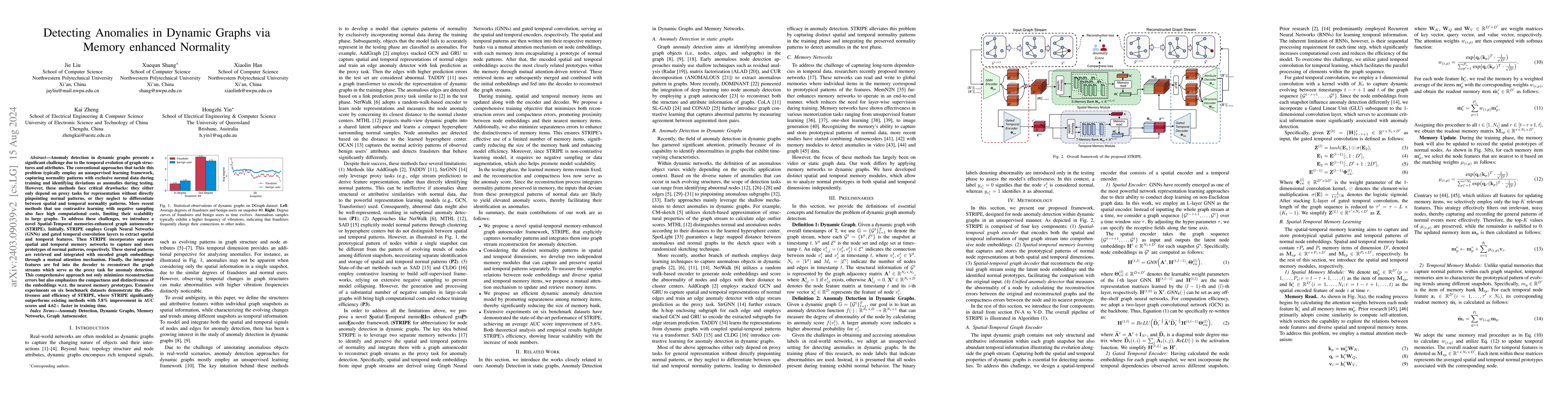The paper proposes a Spatial-Temporal memories-enhanced Graph Autoencoder (STRIPE) for anomaly detection in dynamic graphs, combining GNNs and gated temporal convolutions with spatial and temporal memory networks to capture distinct normality patterns, achieving an average 15.39% improvement in anomaly detection performance.