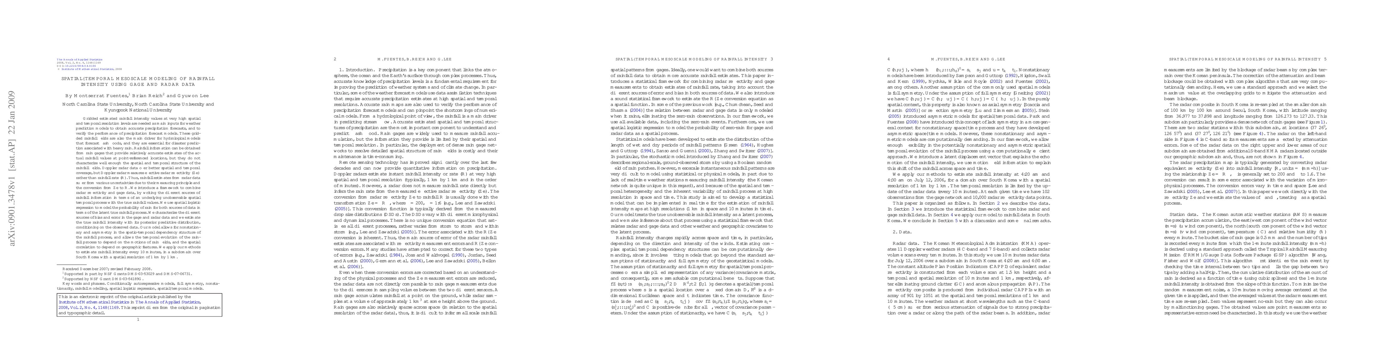 This paper proposes a framework to combine rain gauge and Doppler radar data for high-resolution rainfall intensity modeling. It uses spatial logistic regression to model the probability of rain from both data sources, accounting for biases and errors, and estimates true rainfall intensity through posterior predictive distributions.