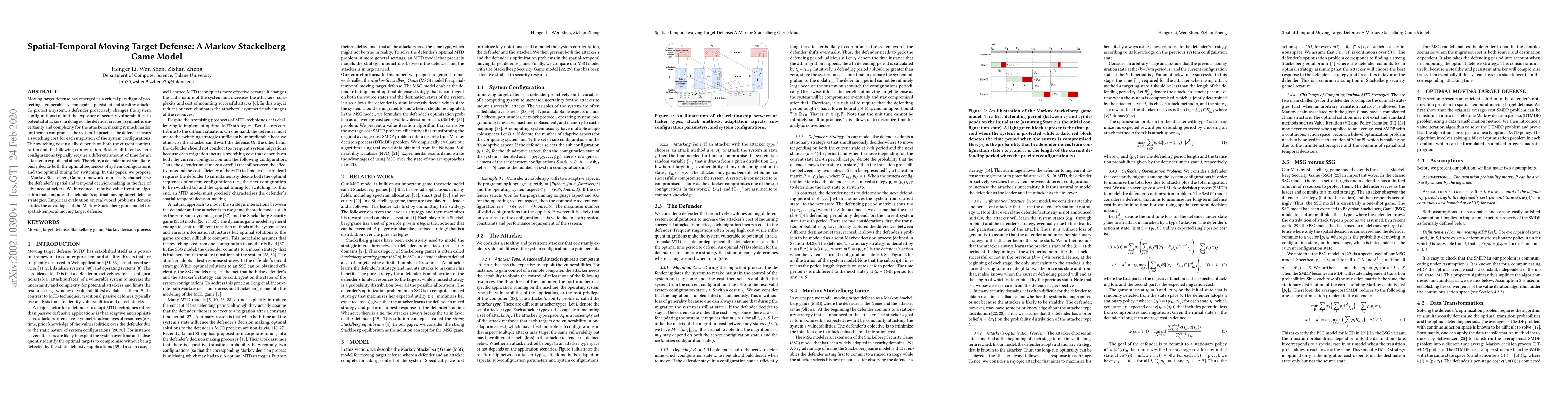 Moving target defense has emerged as a critical paradigm of protecting a vulnerable system against persistent and stealthy attacks. To protect a system, a defender proactively changes the system configurations to limit the exposure of security vulnerabilities to potential attackers. In doing so, the defender creates asymmetric uncertainty and complexity for the attackers, making it much harder for them to compromise the system. In practice, the defender incurs a switching cost for each migration of the system configurations. The switching cost usually depends on both the current configuration and the following configuration. Besides, different system configurations typically require a different amount of time for an attacker to exploit and attack. Therefore, a defender must simultaneously decide both the optimal sequences of system configurations and the optimal timing for switching. In this paper, we propose a Markov Stackelberg Game framework to precisely characterize the defender's spatial and temporal decision-making in the face of advanced attackers. We introduce a relative value iteration algorithm that computes the defender's optimal moving target defense strategies. Empirical evaluation on real-world problems demonstrates the advantages of the Markov Stackelberg game model for spatial-temporal moving target defense.