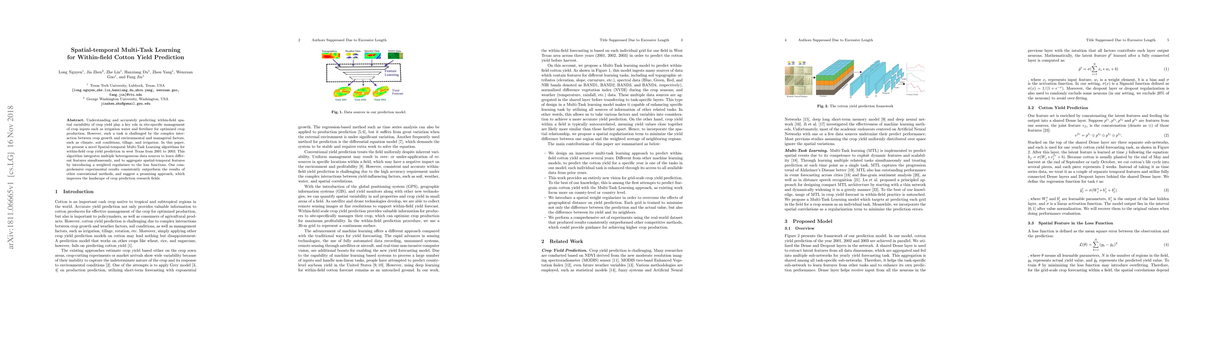 Understanding and accurately predicting within-field spatial variability of crop yield play a key role in site-specific management of crop inputs such as irrigation water and fertilizer for optimized crop production. However, such a task is challenged by the complex interaction between crop growth and environmental and managerial factors, such as climate, soil conditions, tillage, and irrigation. In this paper, we present a novel Spatial-temporal Multi-Task Learning algorithms for within-field crop yield prediction in west Texas from 2001 to 2003. This algorithm integrates multiple heterogeneous data sources to learn different features simultaneously, and to aggregate spatial-temporal features by introducing a weighted regularizer to the loss functions. Our comprehensive experimental results consistently outperform the results of other conventional methods, and suggest a promising approach, which improves the landscape of crop prediction research fields.