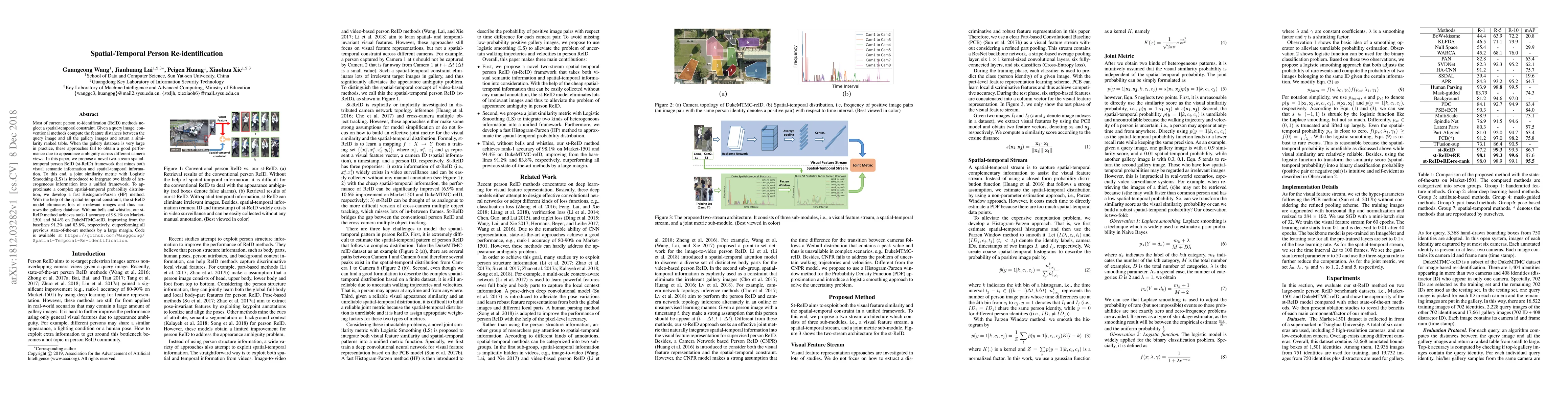 This paper proposes a novel spatial-temporal person re-identification (st-ReID) framework that incorporates visual semantic and spatial-temporal information to improve re-identification accuracy. The method achieves significant improvements in rank-1 accuracy on Market-1501 and DukeMTMC-reID datasets, outperforming previous state-of-the-art methods.