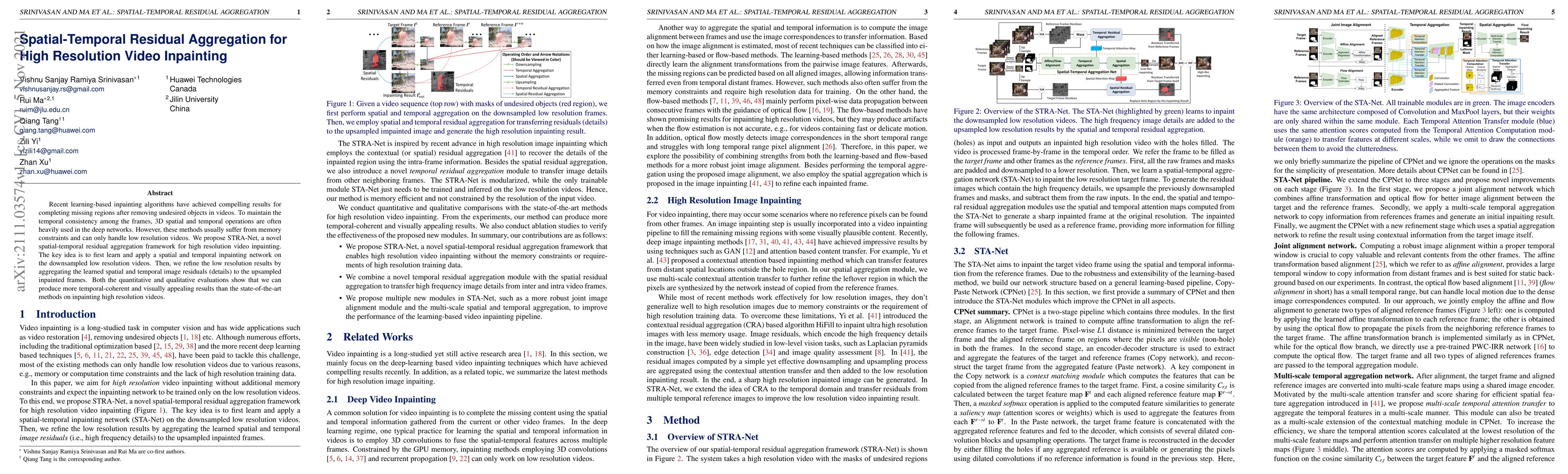 STRA-Net introduces a spatial-temporal residual aggregation framework for high resolution video inpainting, leveraging downsampled low resolution processing and residual refinement to achieve temporal consistency and high-quality results. The method outperforms existing techniques in both quantitative metrics and visual quality for high resolution video inpainting.