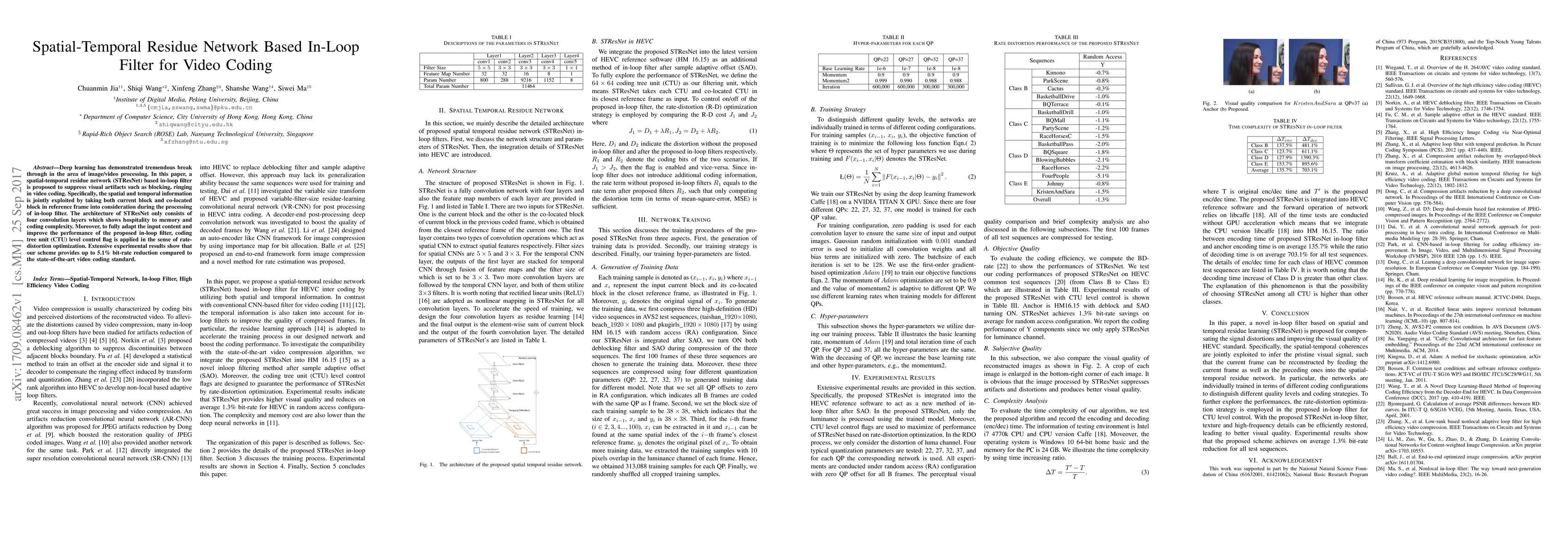 This paper proposes a spatial-temporal residue network (STResNet) based in-loop filter to reduce visual artifacts like blocking and ringing in video coding. The STResNet leverages both spatial and temporal information, achieving up to 5.1% bit-rate reduction compared to the current standard, while maintaining low memory and coding complexity.
