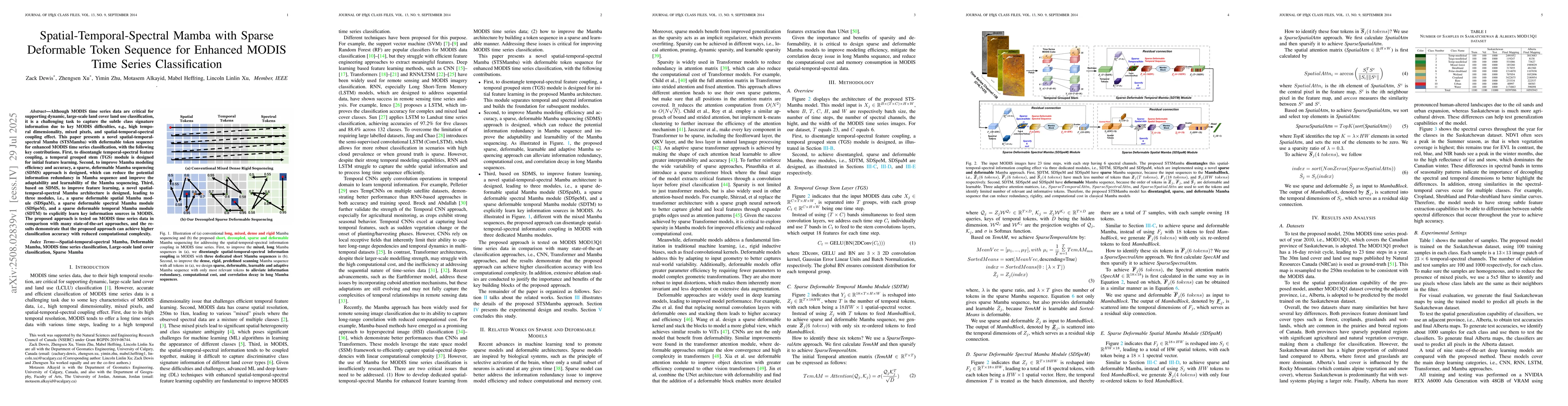 Although MODIS time series data are critical for supporting dynamic, large-scale land cover land use classification, it is a challenging task to capture the subtle class signature information due to key MODIS difficulties, e.g., high temporal dimensionality, mixed pixels, and spatial-temporal-spectral coupling effect. This paper presents a novel spatial-temporal-spectral Mamba (STSMamba) with deformable token sequence for enhanced MODIS time series classification, with the following key contributions. First, to disentangle temporal-spectral feature coupling, a temporal grouped stem (TGS) module is designed for initial feature learning. Second, to improve Mamba modeling efficiency and accuracy, a sparse, deformable Mamba sequencing (SDMS) approach is designed, which can reduce the potential information redundancy in Mamba sequence and improve the adaptability and learnability of the Mamba sequencing. Third, based on SDMS, to improve feature learning, a novel spatial-temporal-spectral Mamba architecture is designed, leading to three modules, i.e., a sparse deformable spatial Mamba module (SDSpaM), a sparse deformable spectral Mamba module (SDSpeM), and a sparse deformable temporal Mamba module (SDTM) to explicitly learn key information sources in MODIS. The proposed approach is tested on MODIS time series data in comparison with many state-of-the-art approaches, and the results demonstrate that the proposed approach can achieve higher classification accuracy with reduced computational complexity.