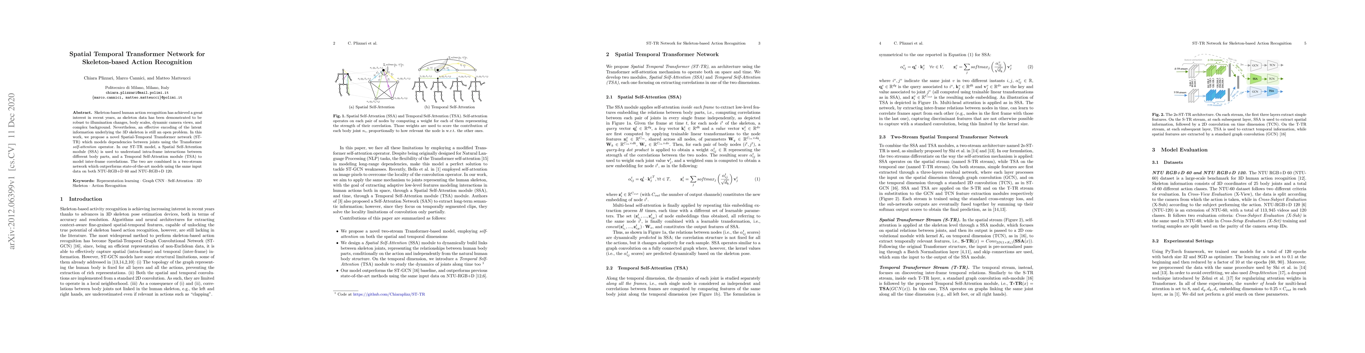 This paper proposes a Spatial-Temporal Transformer Network (ST-TR) for skeleton-based action recognition that employs spatial and temporal self-attention modules to model joint dependencies and inter-frame correlations, outperforming existing state-of-the-art models on NTU-RGB+D datasets.