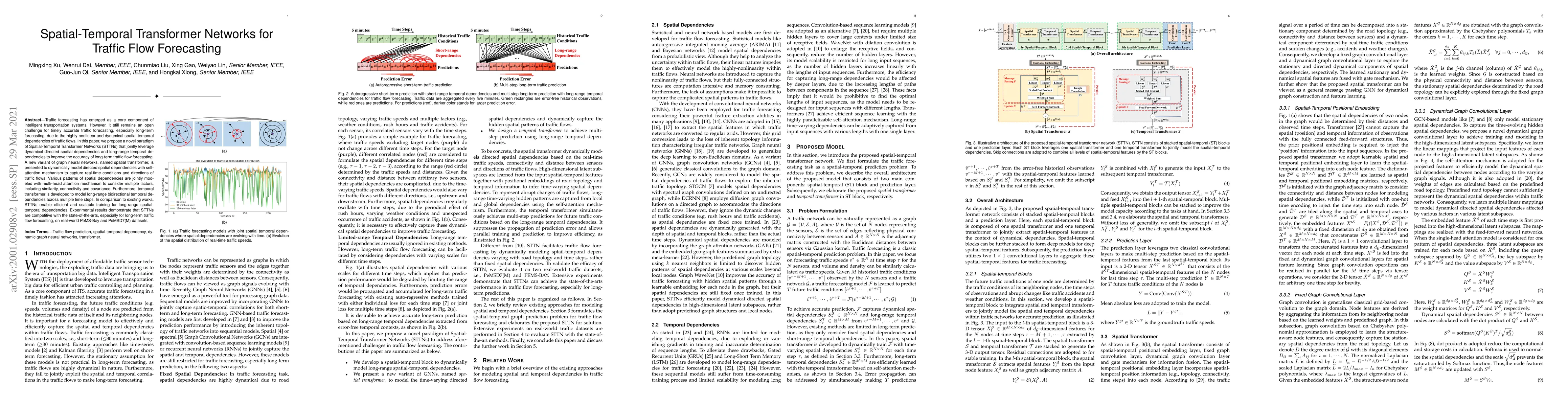 This paper proposes Spatial-Temporal Transformer Networks (STTNs) to enhance long-term traffic flow forecasting by leveraging spatial and temporal dependencies. The model combines spatial transformers with self-attention for dynamic spatial dependencies and temporal transformers for long-range temporal dependencies, achieving competitive accuracy on real-world datasets.