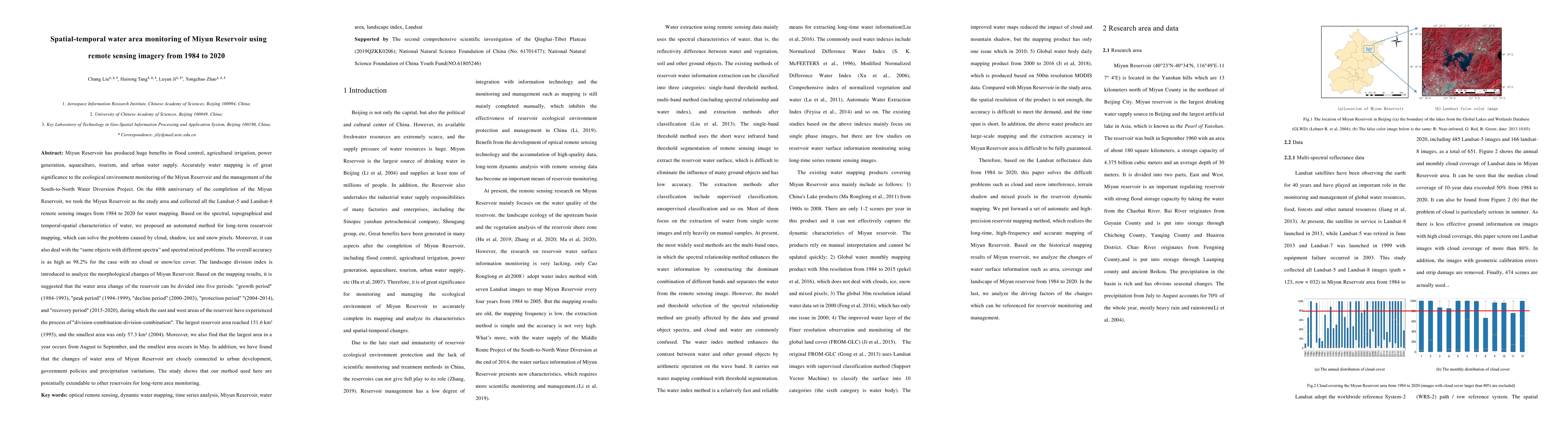 Miyun Reservoir has produced huge benefits in flood control, agricultural irrigation, power generation, aquaculture, tourism, and urban water supply. Accurately water mapping is of great significance to the ecological environment monitoring of the Miyun Reservoir and the management of the South-to-North Water Diversion Project. On the 60th anniversary of the completion of the Miyun Reservoir, we took the Miyun Reservoir as the study area and collected all the Landsat-5 and Landsat-8 remote sensing images from 1984 to 2020 for water mapping. Based on the spectral, topographical and temporal-spatial characteristics of water, we proposed an automated method for long-term researvoir mapping, which can solve the problems caused by cloud, shadow, ice and snow pixels. Moreover, it can also deal with 'the same objects with different spectra' and spectral mixed problems. The overall accuracy is as high as 98.2% for the case with no cloud or snow/ice cover. The landscape division index is introduced to analyze the morphological changes of Miyun Reservoir. Based on the mapping results, we analyzed the changes of Miyun Reservoir from 1984 to 2020 and the driving factors of them.