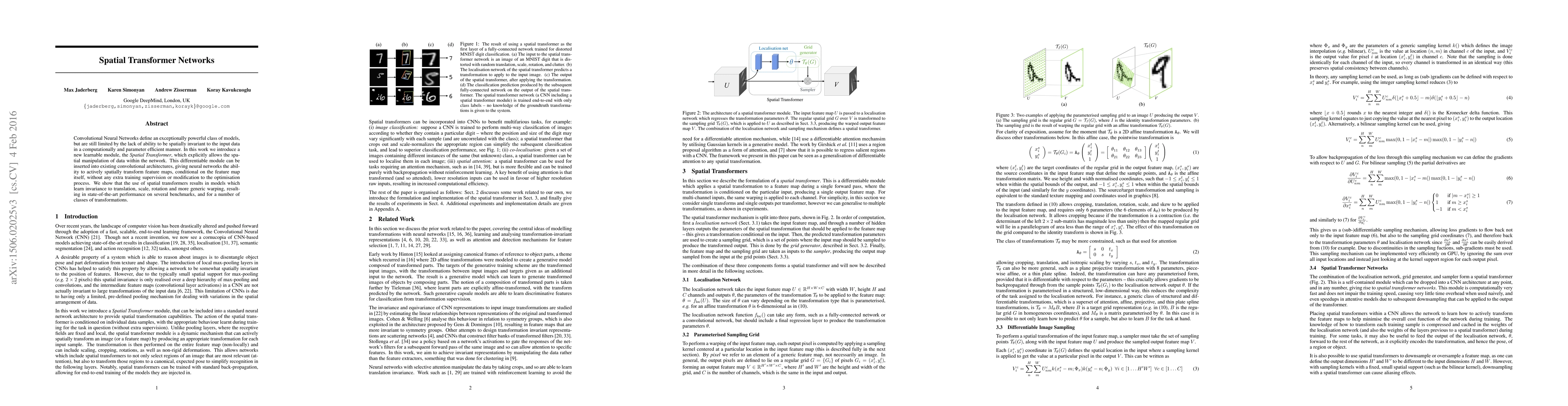 Convolutional Neural Networks define an exceptionally powerful class of models, but are still limited by the lack of ability to be spatially invariant to the input data in a computationally and parameter efficient manner. In this work we introduce a new learnable module, the Spatial Transformer, which explicitly allows the spatial manipulation of data within the network. This differentiable module can be inserted into existing convolutional architectures, giving neural networks the ability to actively spatially transform feature maps, conditional on the feature map itself, without any extra training supervision or modification to the optimisation process. We show that the use of spatial transformers results in models which learn invariance to translation, scale, rotation and more generic warping, resulting in state-of-the-art performance on several benchmarks, and for a number of classes of transformations.