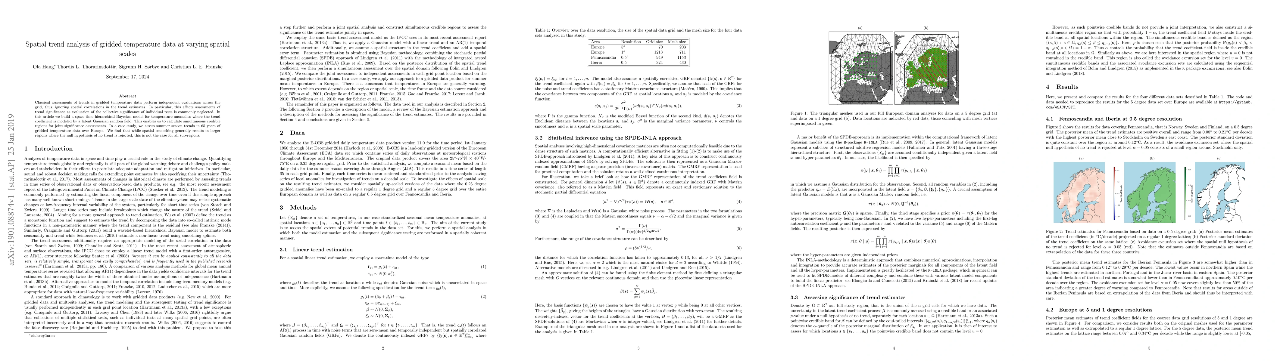 This paper develops a space-time hierarchical Bayesian model to assess spatial trends in gridded temperature data, accounting for spatial correlations. The model calculates simultaneous credible regions for joint significance, revealing that spatial smoothing often increases regions where trends are significant, though not uniformly across all sub-regions in Europe.