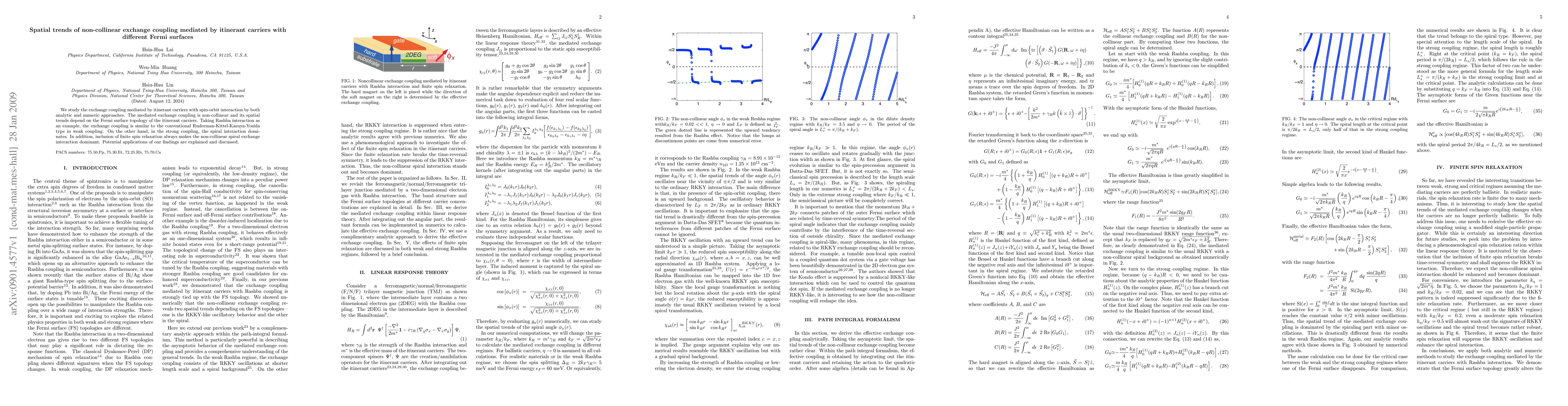 This paper investigates the spatial trends of non-collinear exchange coupling mediated by itinerant carriers, revealing that the coupling's behavior depends on the Fermi surface topology. The study finds that weak coupling resembles RKKY-type interactions, while strong coupling and finite spin relaxation favor spiral interactions.