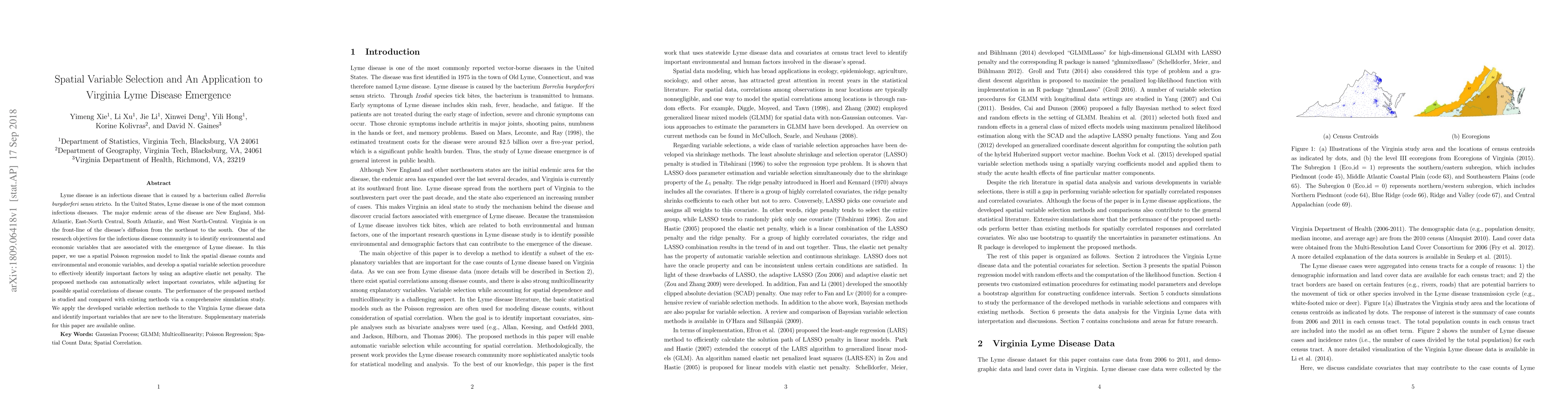 This paper develops a spatial Poisson regression model with adaptive elastic net penalty for spatial variable selection to identify key environmental and economic factors associated with Lyme disease emergence in Virginia. The proposed method outperforms existing techniques in simulations and identifies novel significant variables for the Virginia Lyme disease data.