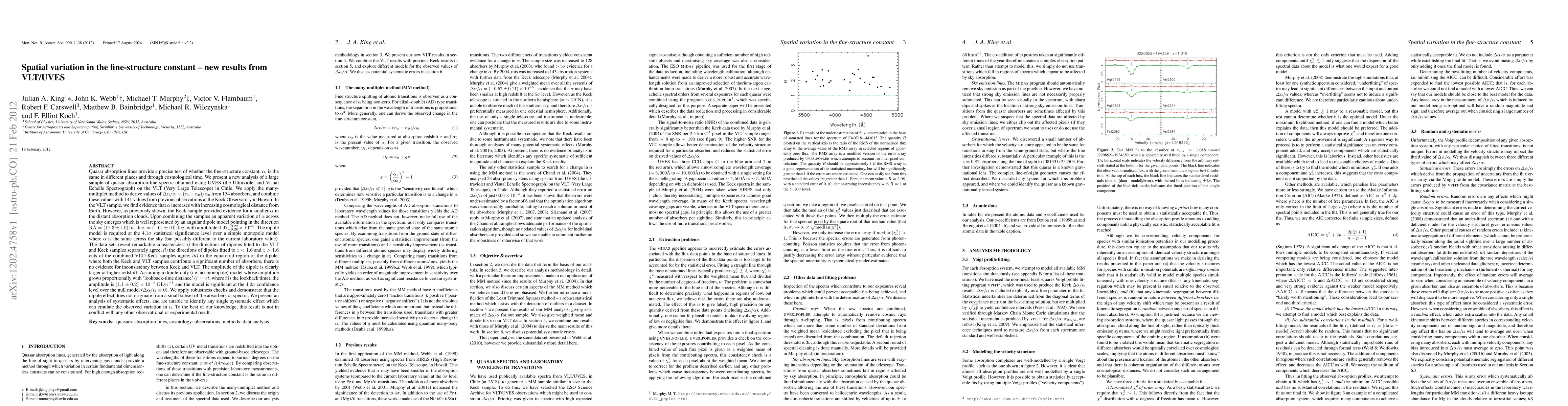 This research analyzes quasar absorption-line spectra from the VLT/UVES, finding evidence for a spatial variation in the fine-structure constant, α, with α increasing with distance. A combined analysis of VLT and Keck samples reveals a dipole model with a significant angular direction and amplitude, suggesting a possible cosmological dependence of α.