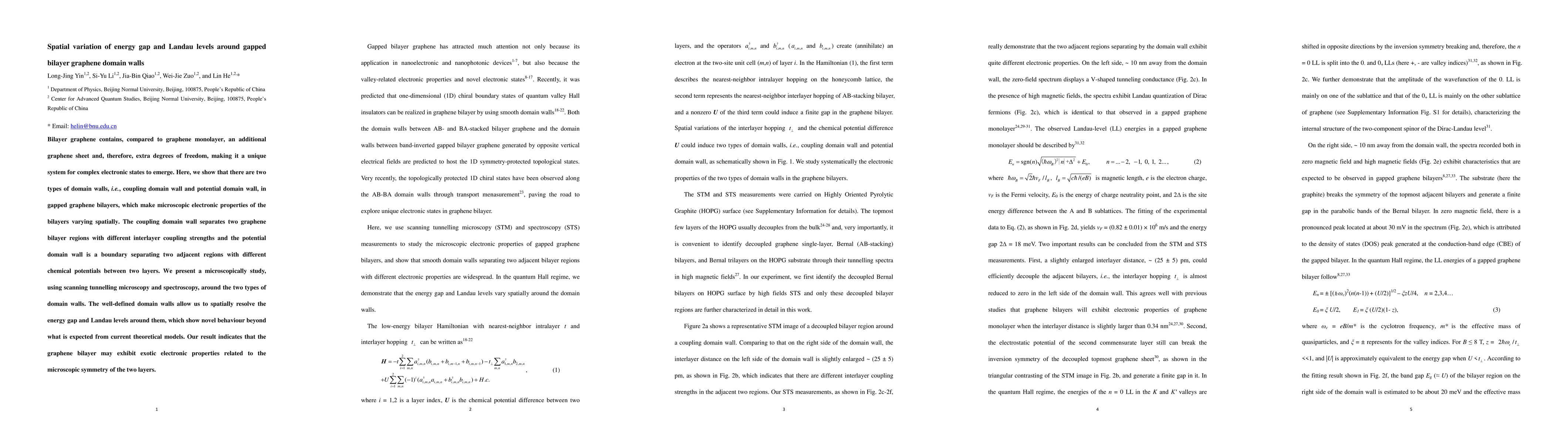 This study reveals the spatial variation of energy gap and Landau levels around domain walls in gapped bilayer graphene, identifying coupling and potential domain walls that influence electronic properties. Scanning tunnelling microscopy and spectroscopy reveal novel electronic behaviours not fully explained by current theories, suggesting exotic properties linked to layer symmetry.