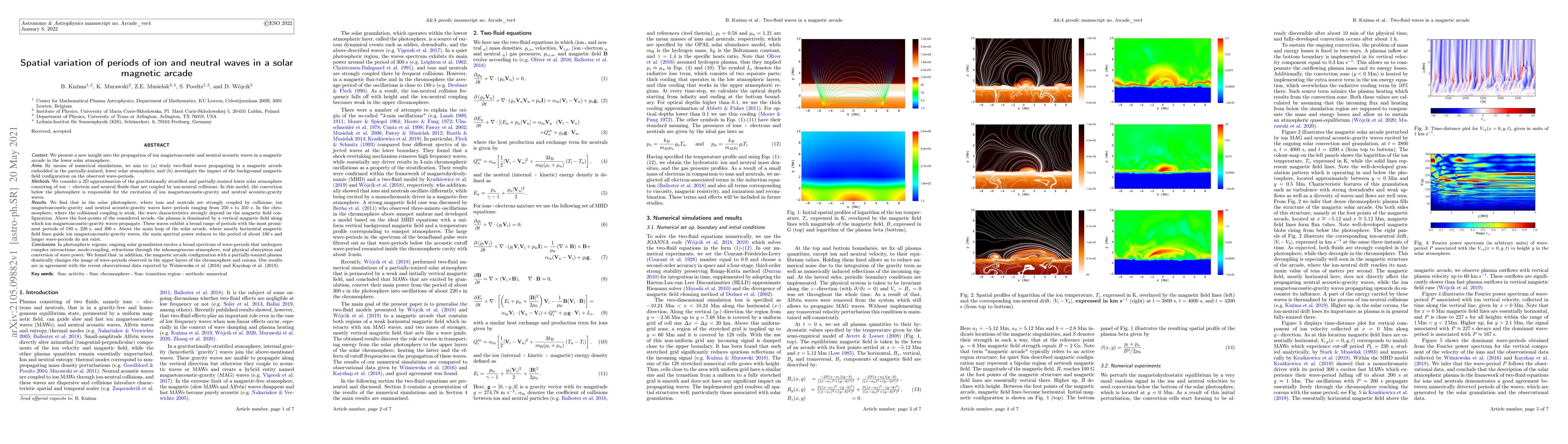 This research investigates the propagation of ion and neutral waves in a solar magnetic arcade using numerical simulations, revealing that wave periods vary significantly with magnetic field configuration and atmospheric layer, aligning with recent observational data.