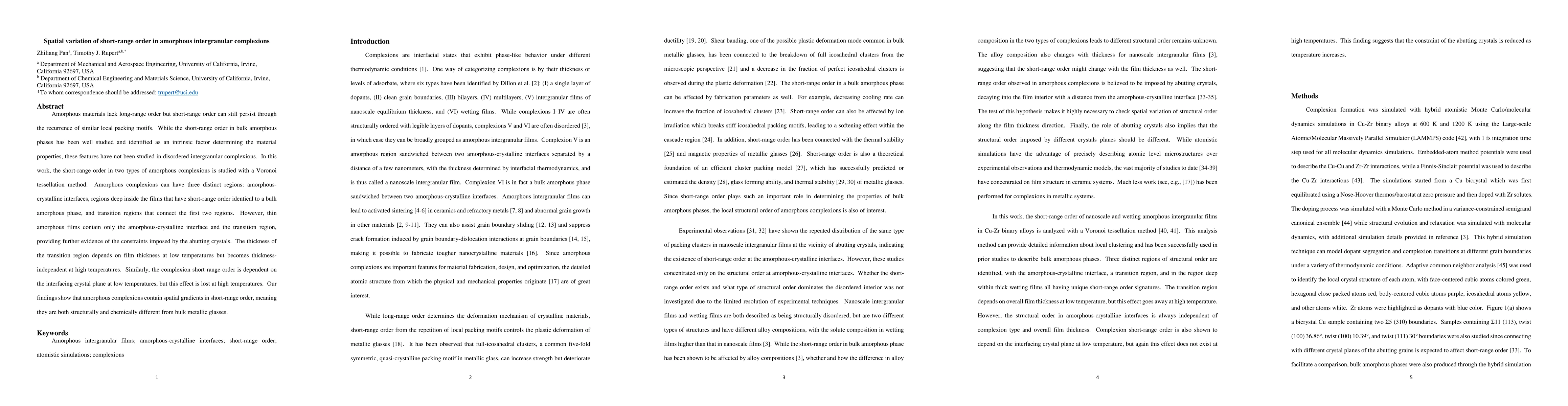 This study investigates the spatial variation of short-range order in amorphous intergranular complexions using a Voronoi tessellation method, revealing that these regions exhibit distinct spatial gradients in short-range order, which differ from bulk amorphous phases and are influenced by temperature and crystal interface.
