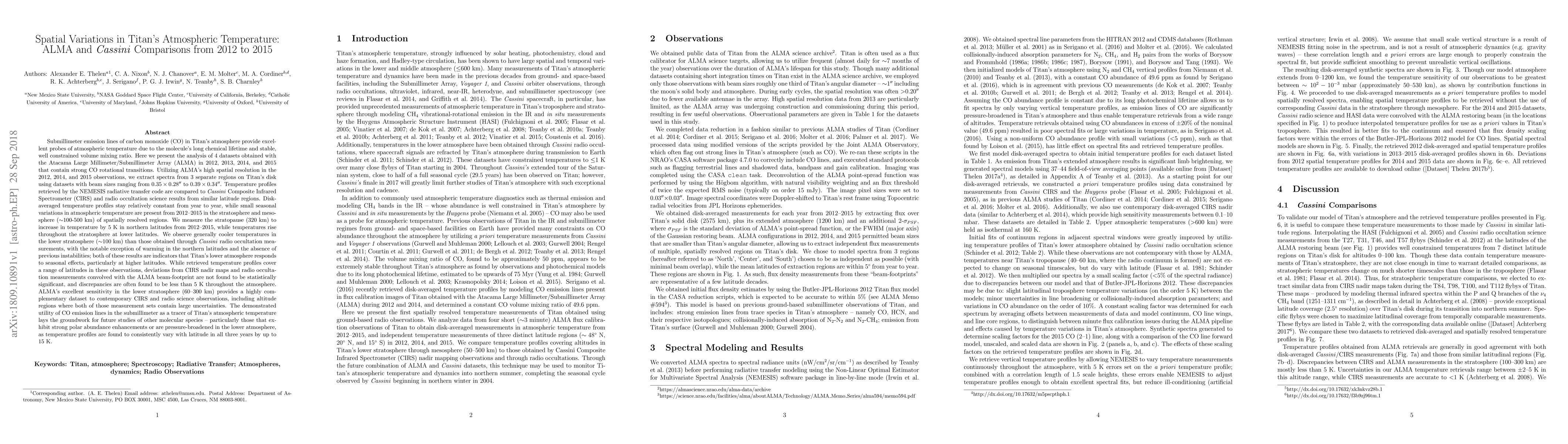 This study analyzes ALMA observations of Titan's atmospheric CO emission lines from 2012 to 2015, revealing seasonal temperature variations in the stratosphere and mesosphere. ALMA's high resolution shows a 5 K increase in the stratopause temperature in northern latitudes, while lower latitudes experience rising temperatures throughout the stratosphere, with minor discrepancies compared to CIRS and radio occultation data.