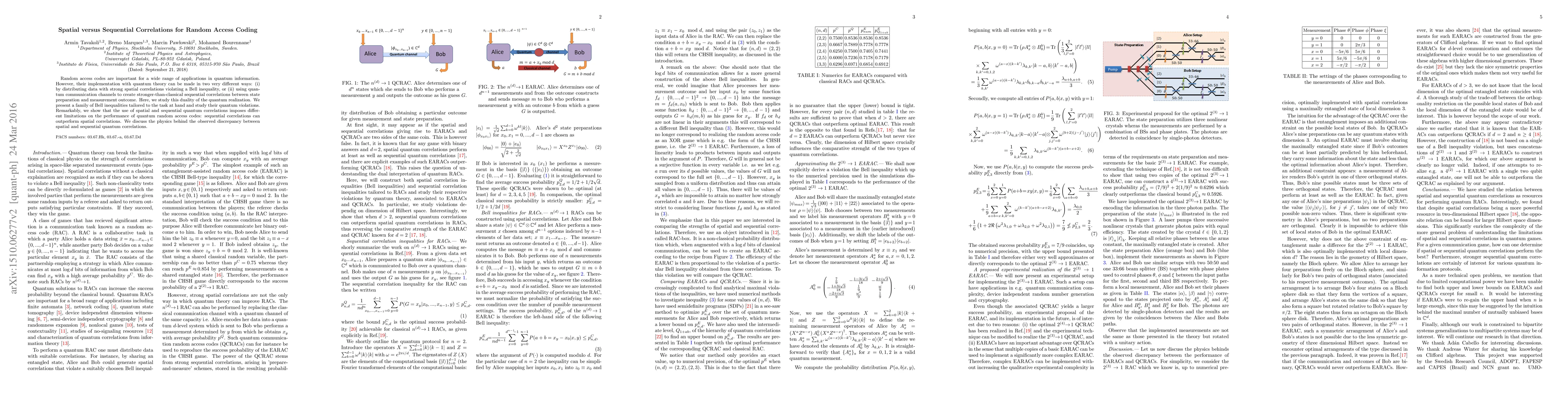 This paper investigates the performance of quantum random access codes using either spatial or sequential quantum correlations, demonstrating that spatial correlations do not always outperform classical strategies, while sequential correlations can provide significant advantages. The study highlights the distinct limitations imposed by each type of quantum correlation on the efficiency of these codes.