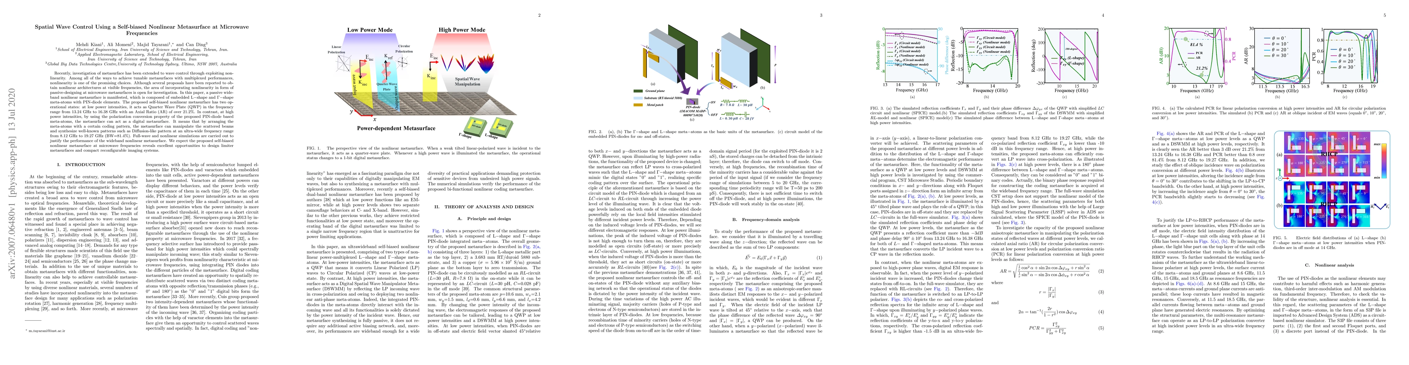 This research introduces a passive, wideband nonlinear metasurface for microwave frequency control using embedded L-shape and u03a3-shape meta-atoms with PIN-diode elements. The metasurface functions as a Quarter Wave Plate (QWP) at low power, and as a digital metasurface with beam manipulation capabilities at high power, synthesizing patterns like Diffusion-like at an ultra-wide frequency range. Full-wave simulations validate its performance, suggesting potential for limiter metasurfaces and compact reconfigurable imaging systems.