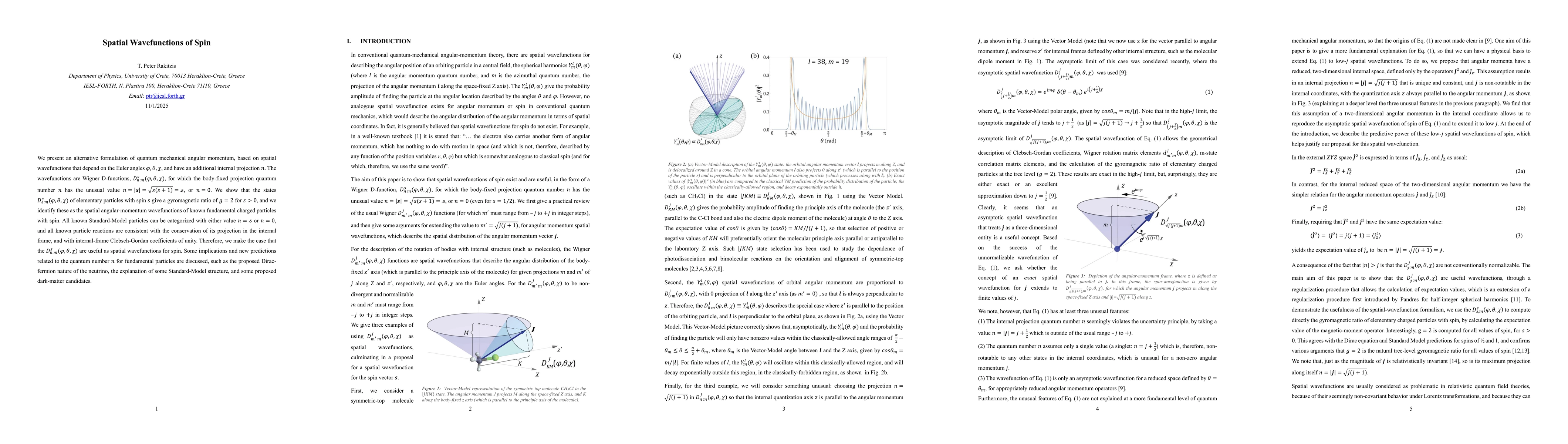 This paper proposes a novel formulation of quantum mechanical angular momentum using spatial wavefunctions based on Wigner D-functions, demonstrating a renormalization method to compute expectation values. The wavefunctions, $D_{n m}^j (\phi, \theta, \chi)$, particularly $D_{\sqrt{j(j+1)},m}^j (\phi, \theta, \chi)$, are applied to fundamental particles, showing a gyromagnetic ratio of $g=2$ for $S>0$ and suggesting implications for particle nature like neutrino's Dirac-fermion status and dark matter candidates.
