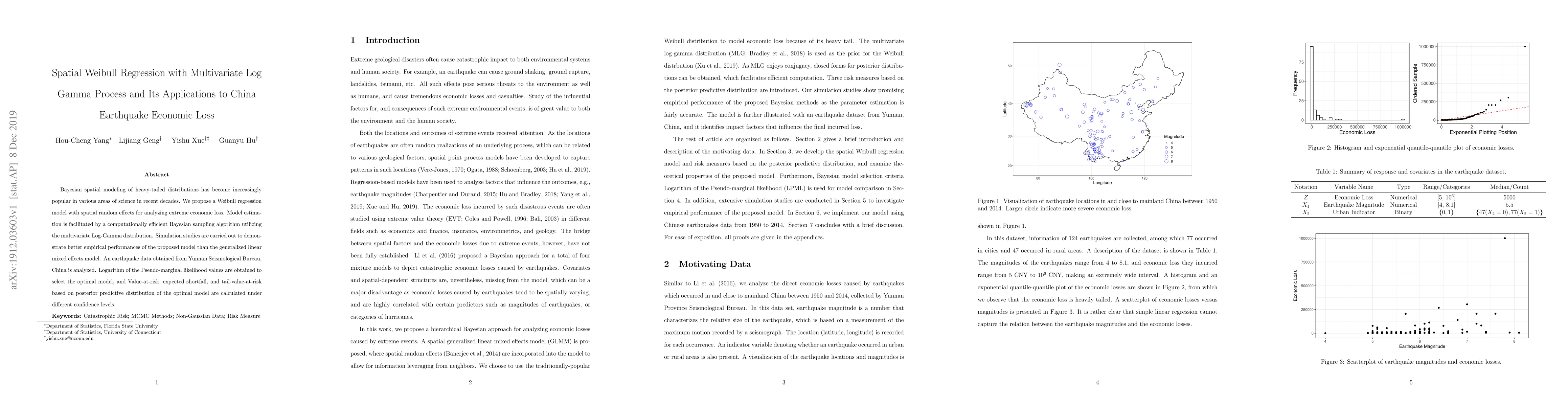 Bayesian spatial modeling of heavy-tailed distributions has become increasingly popular in various areas of science in recent decades. We propose a Weibull regression model with spatial random effects for analyzing extreme economic loss. Model estimation is facilitated by a computationally efficient Bayesian sampling algorithm utilizing the multivariate Log-Gamma distribution. Simulation studies are carried out to demonstrate better empirical performances of the proposed model than the generalized linear mixed effects model. An earthquake data obtained from Yunnan Seismological Bureau, China is analyzed. Logarithm of the Pseudo-marginal likelihood values are obtained to select the optimal model, and Value-at-risk, expected shortfall, and tail-value-at-risk based on posterior predictive distribution of the optimal model are calculated under different confidence levels.