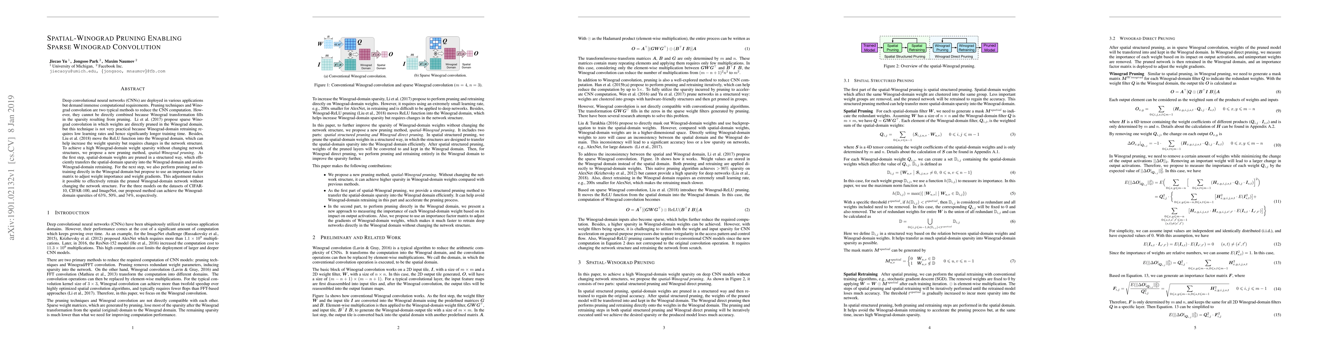 The paper proposes spatial-Winograd pruning, a method that combines spatial-domain and Winograd-domain pruning to achieve high Winograd-domain weight sparsity without requiring network structure changes or lengthy retraining. This method achieves sparsities of 63%, 50%, and 74% on CIFAR10, CIFAR-100, and ImageNet datasets, respectively.