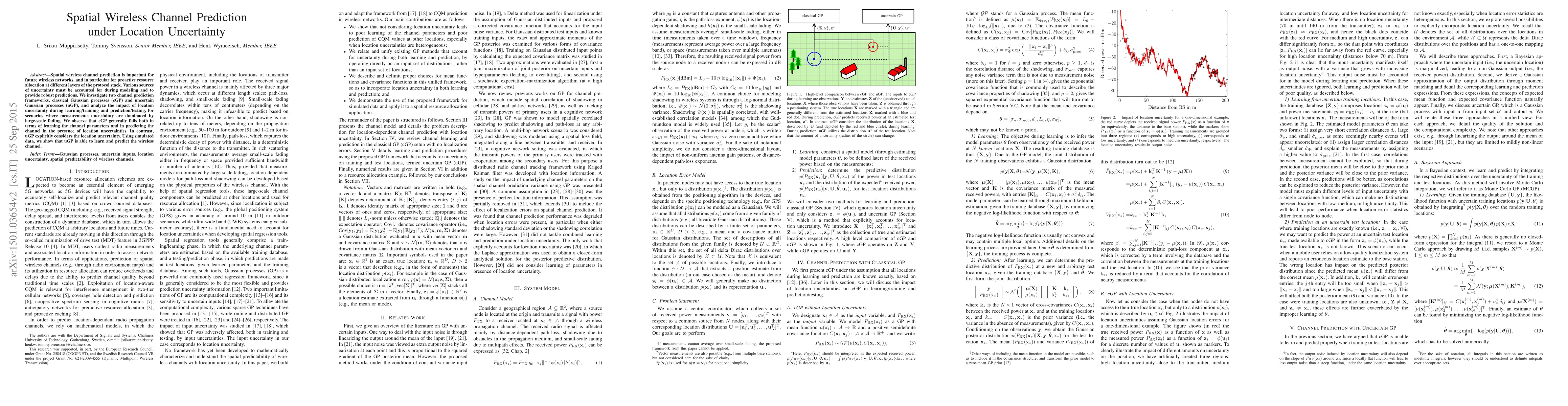 Spatial wireless channel prediction is important for future wireless networks, and in particular for proactive resource allocation at different layers of the protocol stack. Various sources of uncertainty must be accounted for during modeling and to provide robust predictions. We investigate two channel prediction frameworks, classical Gaussian processes (cGP) and uncertain Gaussian processes (uGP), and analyze the impact of location uncertainty during learning/training and prediction/testing, for scenarios where measurements uncertainty are dominated by large-scale fading. We observe that cGP generally fails both in terms of learning the channel parameters and in predicting the channel in the presence of location uncertainties.\textcolor{blue}{{} }In contrast, uGP explicitly considers the location uncertainty. Using simulated data, we show that uGP is able to learn and predict the wireless channel.