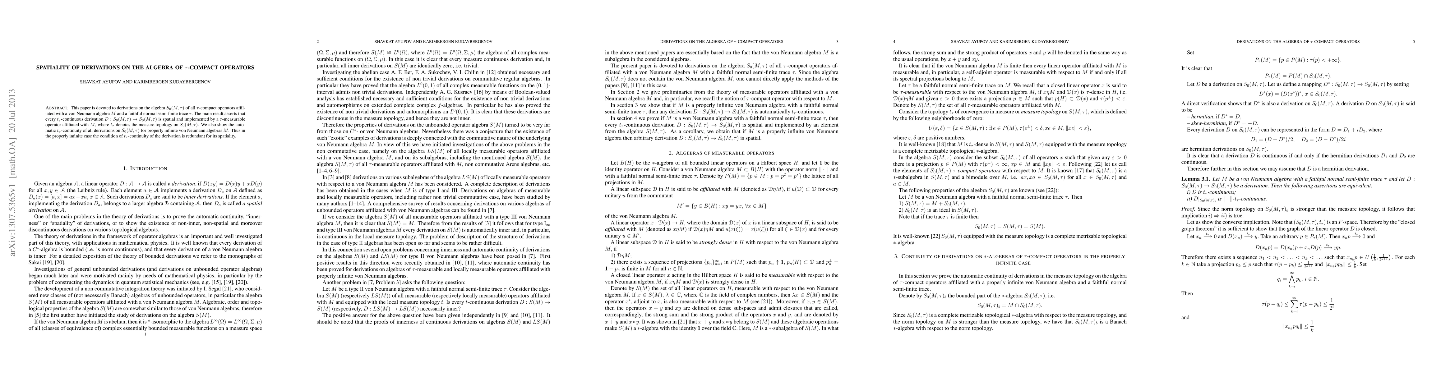 This paper investigates derivations on the algebra of $\tau$-compact operators affiliated with a von Neumann algebra, showing that every $t_\tau$-continuous derivation is spatial and implemented by a $\tau$-measurable operator. It also proves the automatic $t_\tau$-continuity of all derivations in properly infinite von Neumann algebras, rendering the continuity condition unnecessary for spatiality in this context.