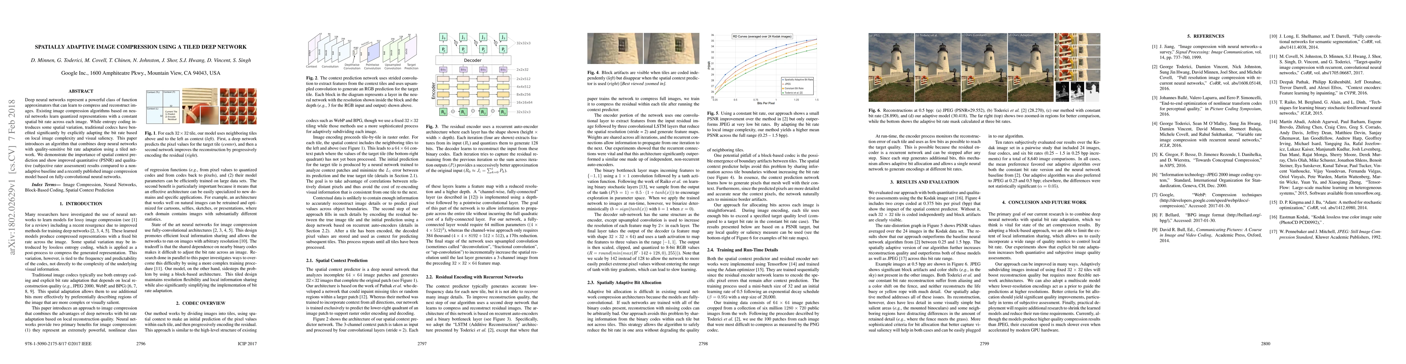 This paper proposes a spatially adaptive image compression method using a tiled deep network that adjusts the bit rate based on local image complexity and visual saliency, achieving better quantitative and qualitative results than non-adaptive baselines and fully-convolutional neural network models. The approach leverages spatial context prediction to enhance compression efficiency.