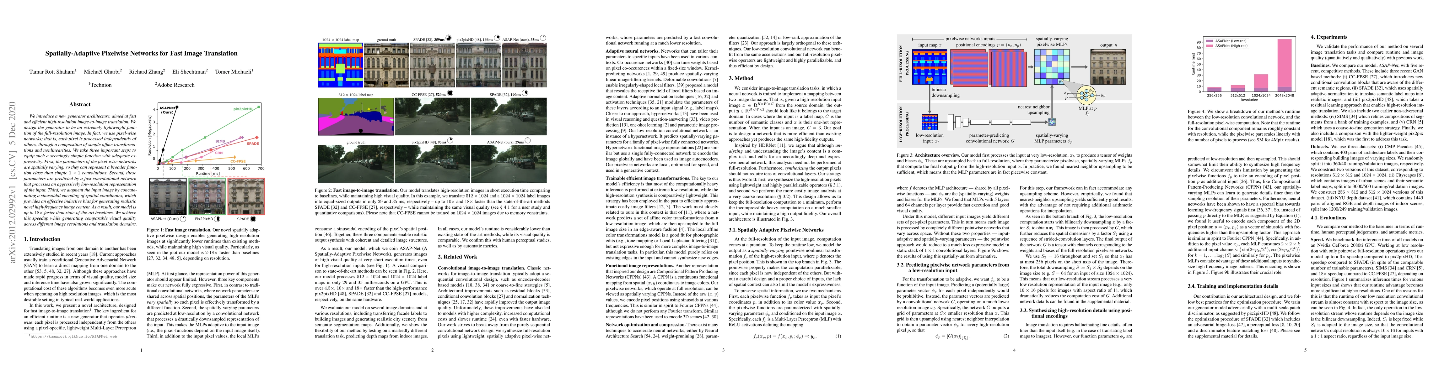 We introduce a new generator architecture, aimed at fast and efficient high-resolution image-to-image translation. We design the generator to be an extremely lightweight function of the full-resolution image. In fact, we use pixel-wise networks; that is, each pixel is processed independently of others, through a composition of simple affine transformations and nonlinearities. We take three important steps to equip such a seemingly simple function with adequate expressivity. First, the parameters of the pixel-wise networks are spatially varying so they can represent a broader function class than simple 1x1 convolutions. Second, these parameters are predicted by a fast convolutional network that processes an aggressively low-resolution representation of the input; Third, we augment the input image with a sinusoidal encoding of spatial coordinates, which provides an effective inductive bias for generating realistic novel high-frequency image content. As a result, our model is up to 18x faster than state-of-the-art baselines. We achieve this speedup while generating comparable visual quality across different image resolutions and translation domains.