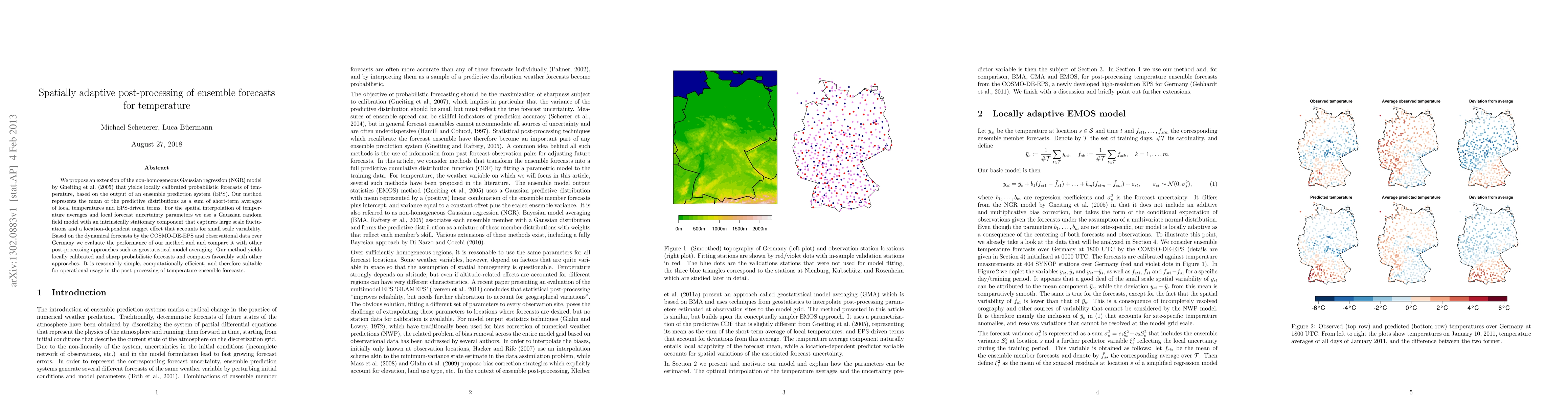 This paper proposes an extension of the non-homogeneous Gaussian regression model to generate locally calibrated probabilistic temperature forecasts from ensemble prediction systems. The method combines short-term local averages and ensemble-driven terms, and uses a Gaussian random field model for spatial interpolation, showing superior performance compared to other post-processing techniques.