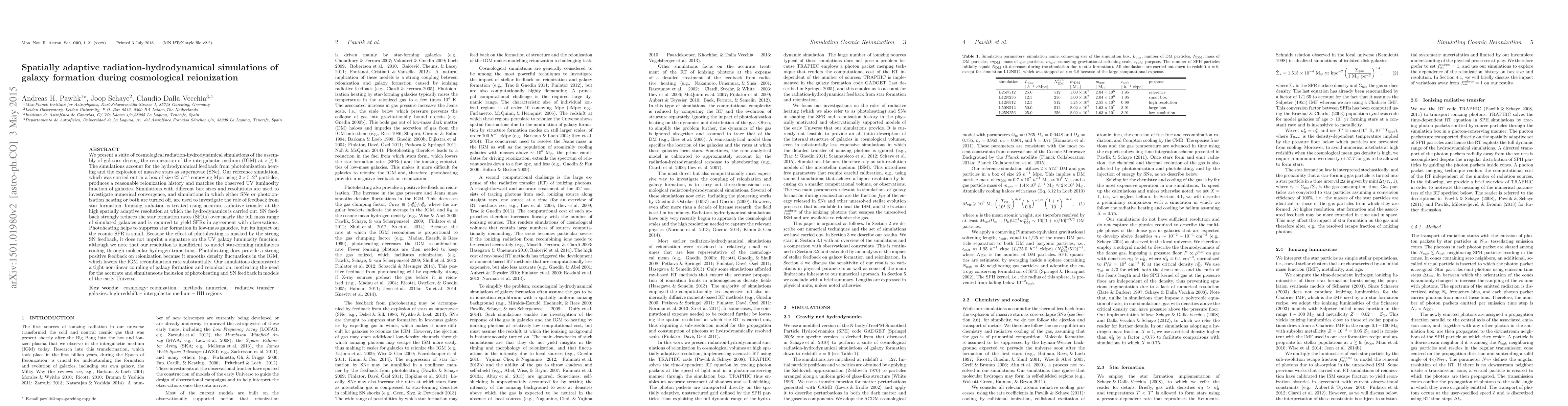 We present a suite of cosmological radiation-hydrodynamical simulations of the assembly of galaxies driving the reionization of the intergalactic medium (IGM) at z >~ 6. The simulations account for the hydrodynamical feedback from photoionization heating and the explosion of massive stars as supernovae (SNe). Our reference simulation, which was carried out in a box of size 25 comoving Mpc/h using 2 x 512^3 particles, produces a reasonable reionization history and matches the observed UV luminosity function of galaxies. Simulations with different box sizes and resolutions are used to investigate numerical convergence, and simulations in which either SNe or photoionization heating or both are turned off, are used to investigate the role of feedback from star formation. Ionizing radiation is treated using accurate radiative transfer at the high spatially adaptive resolution at which the hydrodynamics is carried out. SN feedback strongly reduces the star formation rates (SFRs) over nearly the full mass range of simulated galaxies and is required to yield SFRs in agreement with observations. Photoheating helps to suppress star formation in low-mass galaxies, but its impact on the cosmic SFR is small. Because the effect of photoheating is masked by the strong SN feedback, it does not imprint a signature on the UV galaxy luminosity function, although we note that our resolution is insufficient to model star-forming minihaloes cooling through molecular hydrogen transitions. Photoheating does provide a strong positive feedback on reionization because it smooths density fluctuations in the IGM, which lowers the IGM recombination rate substantially. Our simulations demonstrate a tight non-linear coupling of galaxy formation and reionization, motivating the need for the accurate and simultaneous inclusion of photoheating and SN feedback in models of the early Universe.