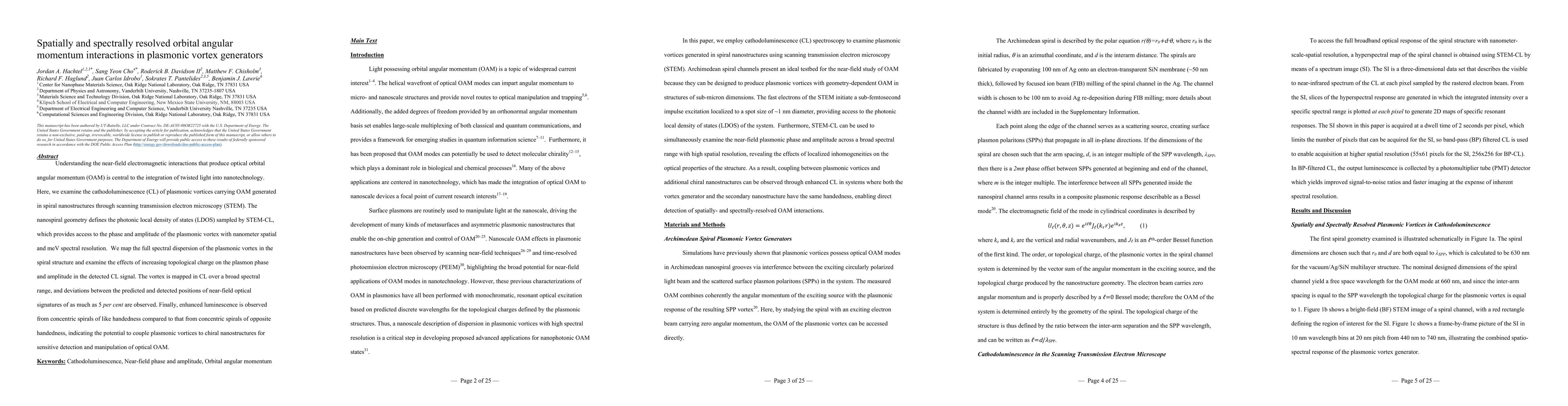 Understanding the near-field electromagnetic interactions that produce optical orbital angular momentum (OAM) is central to the integration of twisted light into nanotechnology. Here, we examine the cathodoluminescence (CL) of plasmonic vortices carrying OAM generated in spiral nanostructures through scanning transmission electron microscopy (STEM). The nanospiral geometry defines the photonic local density of states (LDOS) sampled by STEM-CL, which provides access to the phase and amplitude of the plasmonic vortex with nanometer spatial and meV spectral resolution. We map the full spectral dispersion of the plasmonic vortex in the spiral structure and examine the effects of increasing topological charge on the plasmon phase and amplitude in the detected CL signal. The vortex is mapped in CL over a broad spectral range, and deviations between the predicted and detected positions of near-field optical signatures of as much as 5 per cent are observed. Finally, enhanced luminescence is observed from concentric spirals of like handedness compared to that from concentric spirals of opposite handedness, indicating the potential to couple plasmonic vortices to chiral nanostructures for sensitive detection and manipulation of optical OAM.
