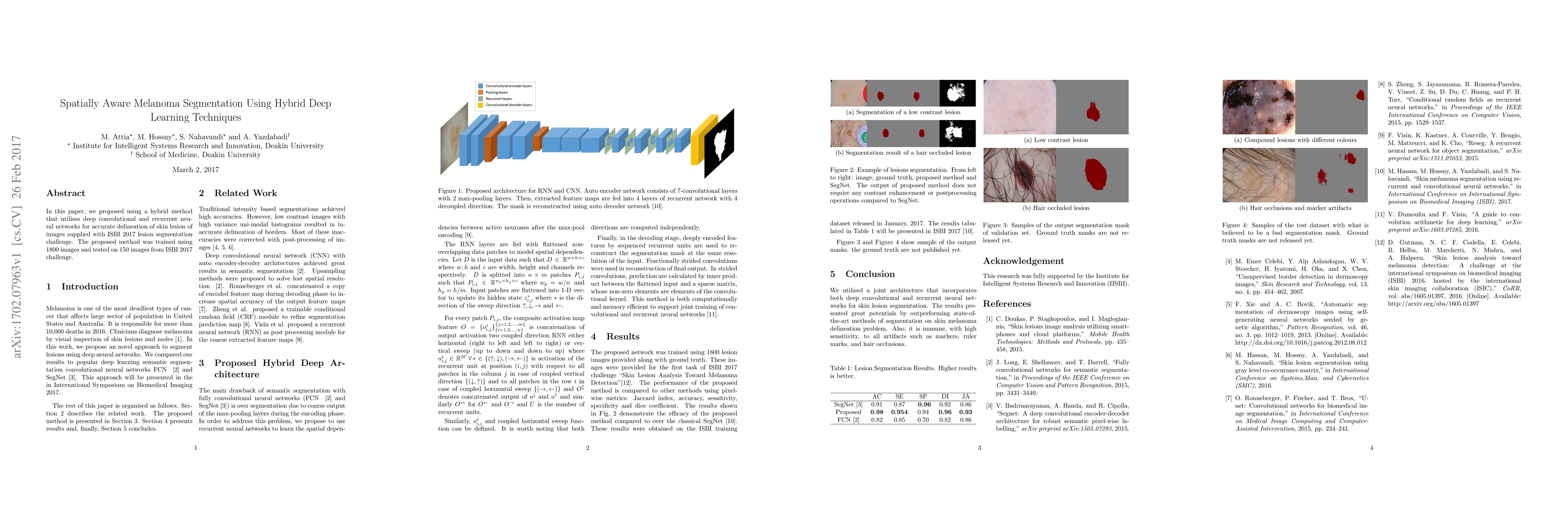 In this paper, we proposed using a hybrid method that utilises deep convolutional and recurrent neural networks for accurate delineation of skin lesion of images supplied with ISBI 2017 lesion segmentation challenge. The proposed method was trained using 1800 images and tested on 150 images from ISBI 2017 challenge.